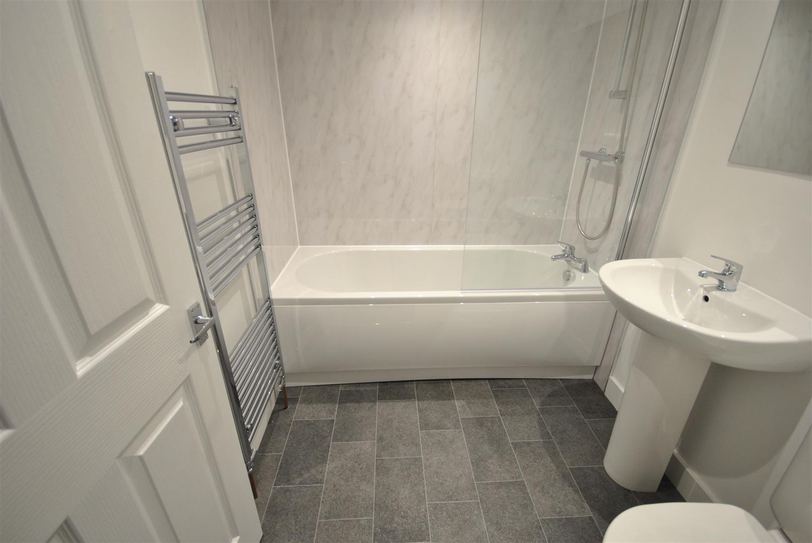 Totally cladded which is great for the ease of cleaning, complimented with a new white bathroom suite and over head mains fed shower bar and glass screen, large chrome towel rail and large over sink mirrow