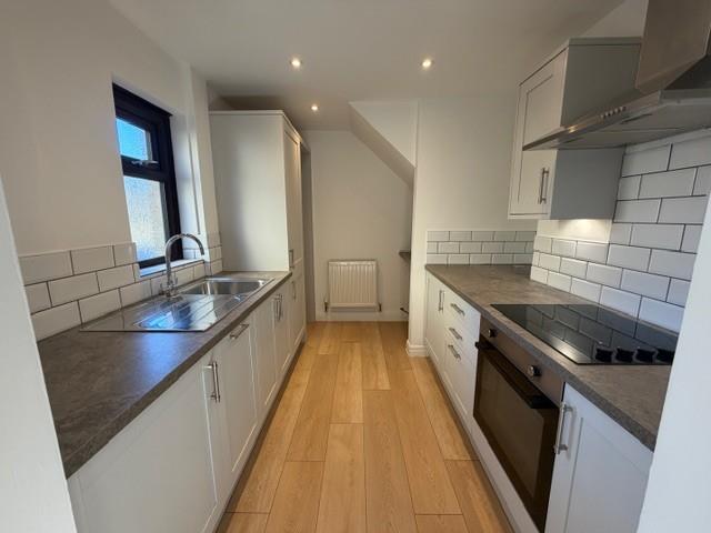 Laminate Flooring. White Splash Back Tiles. Grey Base Units, Cupboards & Drawers with Work Tops. Radiator. Stainless Sink & Drainer. Integrated Dishwasher. Plumbing for Washer. Lamona Oven, Electric Hob & Extractor fan. Double Glazed Window.