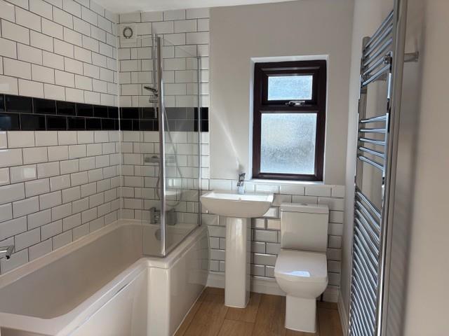 Laminate Flooring. Part Tiled Bathroom. Chrome Wall Radiator. Frosted Double Glazed Window. Built In Shelves. White WC, Basin, Bath with Shower over.