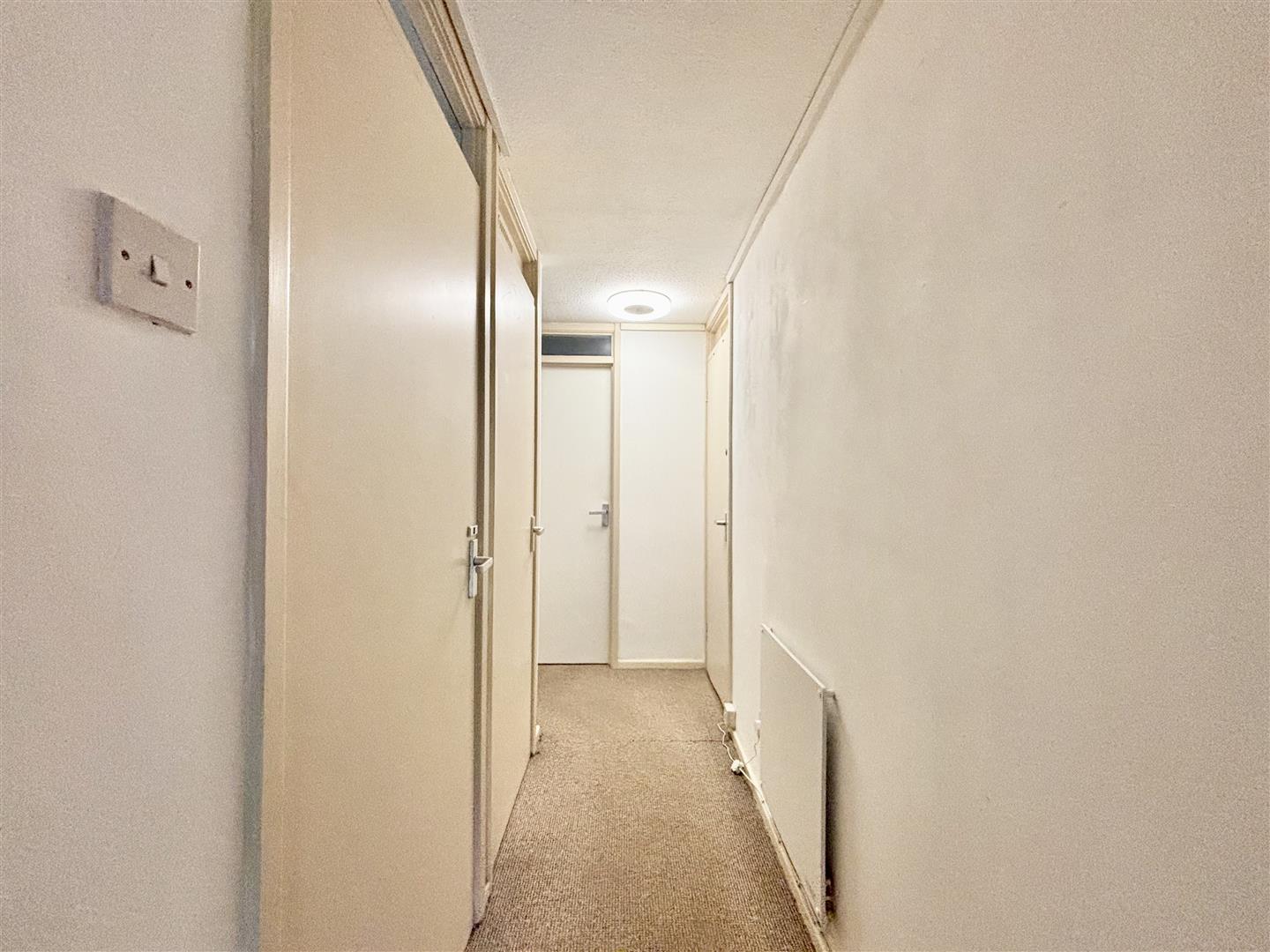 The front entrance door leads into an 'L' shaped hallway with doors off to the lounge, bedroom, bathroom and two useful storage cupboards. Electric wall heater.