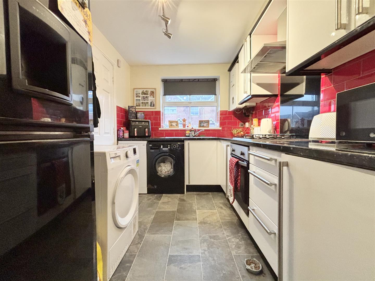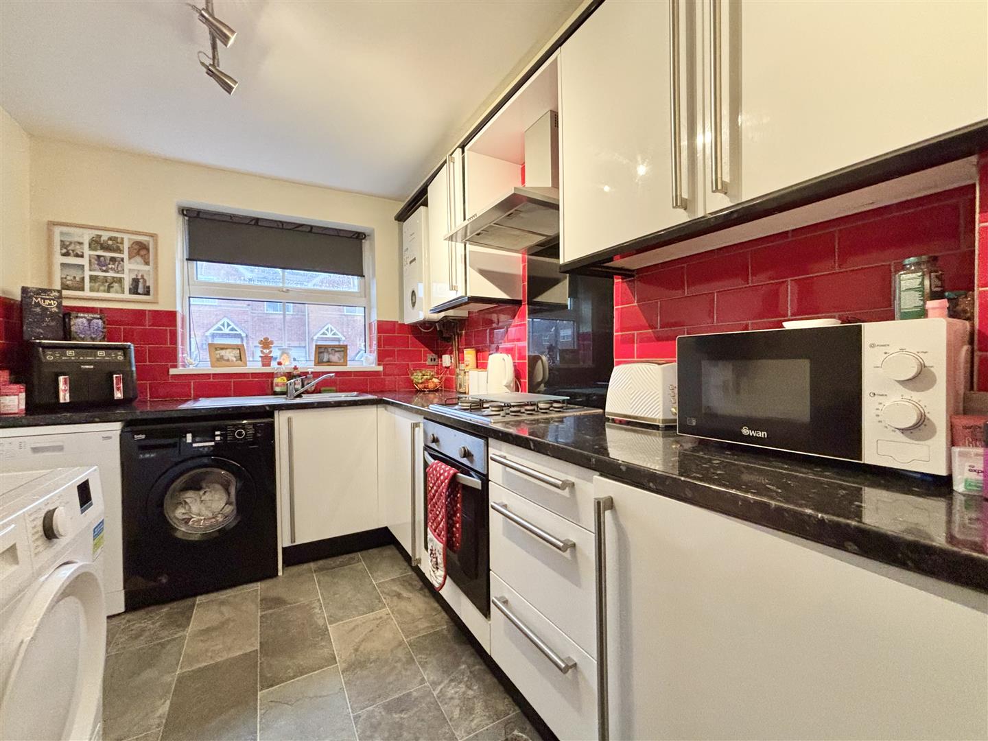 Fitted with a range of base and wall cabinets working surfaces over and splash-back wall tiling. Stainless steel sink & drainer, plumbing for a washing machine, central heating boiler and integrated appliances including a four ring gas hob, electric oven and an extractor over. Open to: