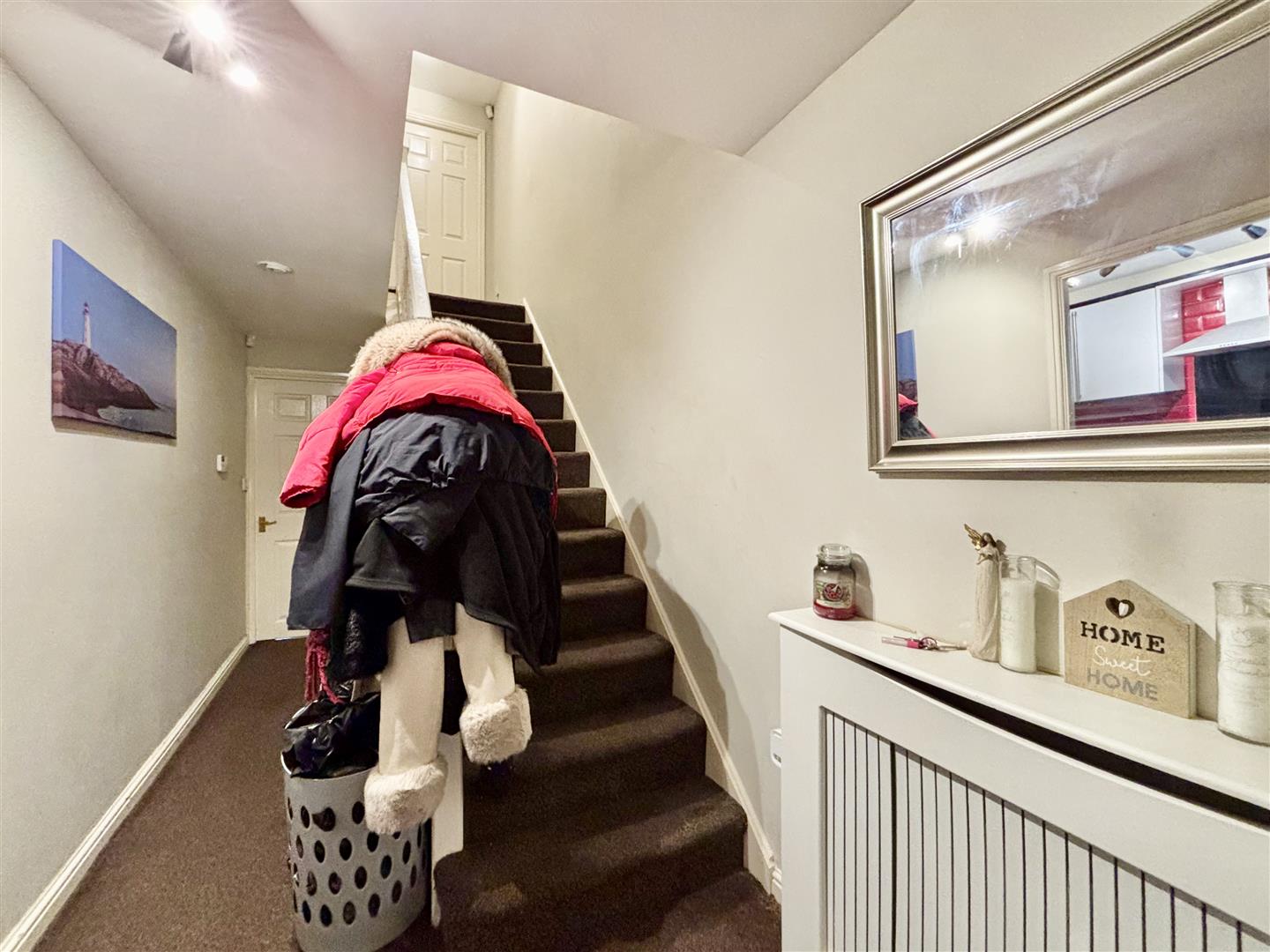 Stairs lead off to the first floor, central heating radiator and doors to the kitchen, lounge and WC.