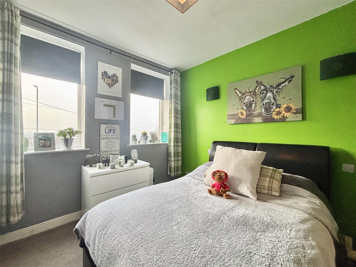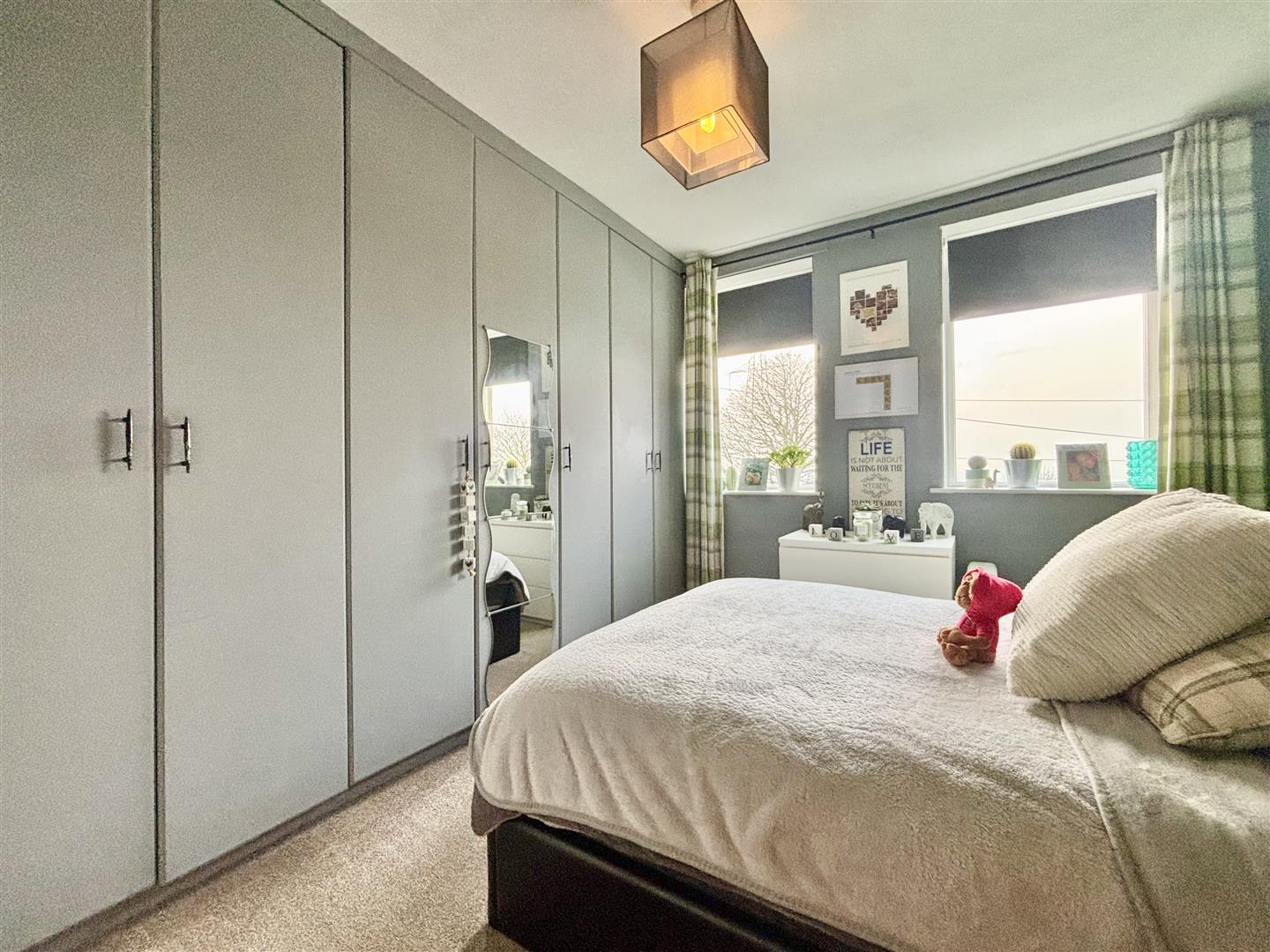 Two windows to the front elevation, wall-to-wall fitted wardrobes and a central heating radiator.