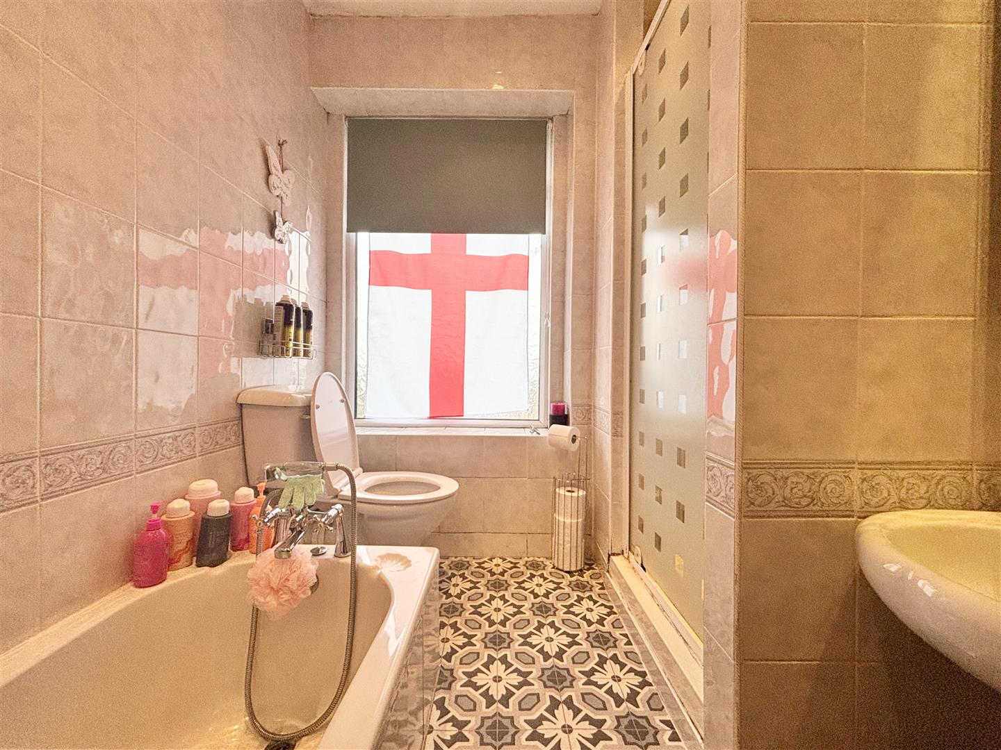 White bathroom suite comprising of a panelled bath, separate shower cubicle with glass door, pedestal washbasin and a low flush WC. Heated towel rail and a window to the side elevation.