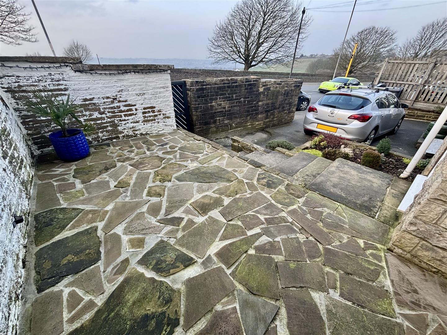 Open plan tarmac driveway to the front with an off-road parking space and access to the garage. Steps up to the porch leading to the kitchen and also an external door leading into the lounge. Paved patio seating area.
