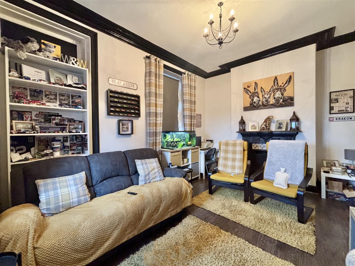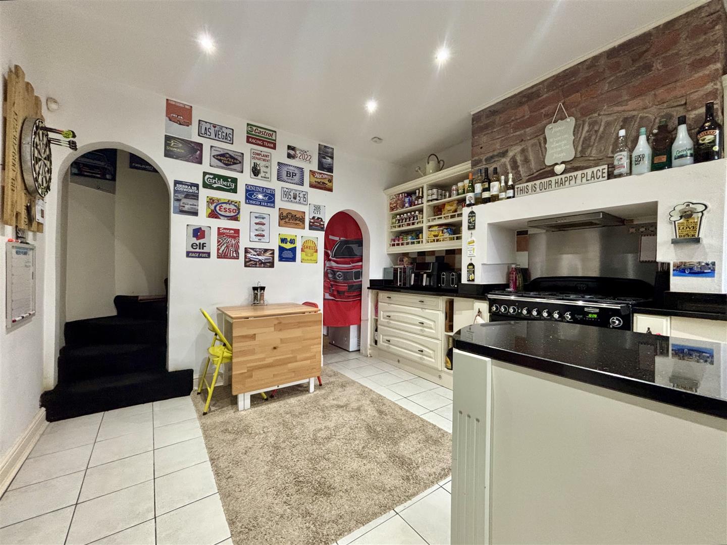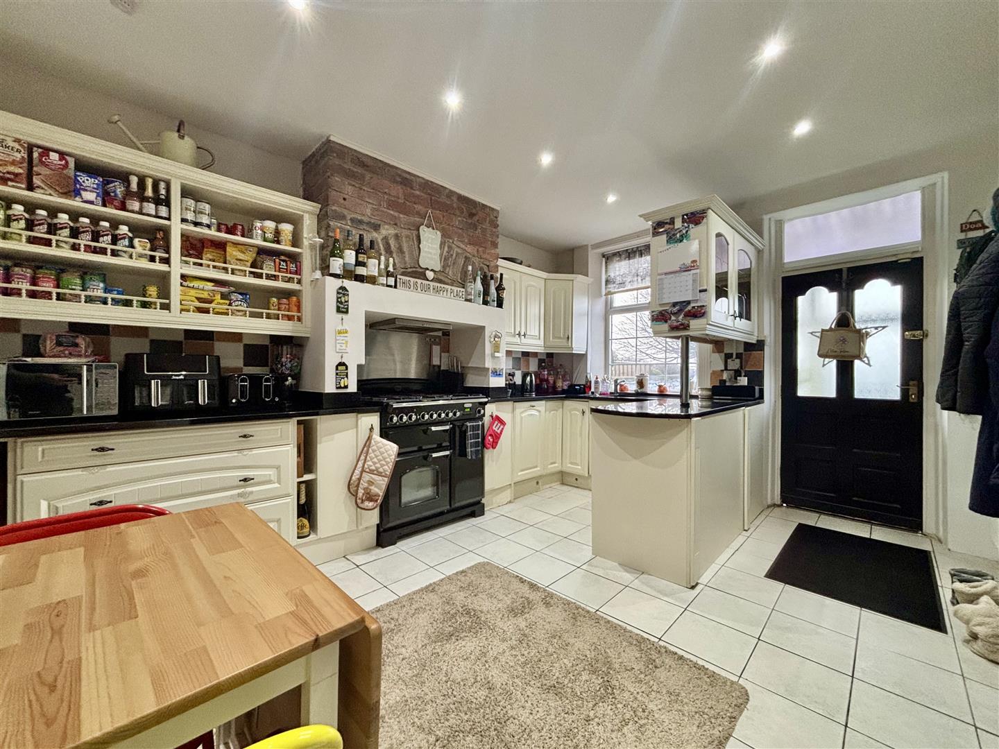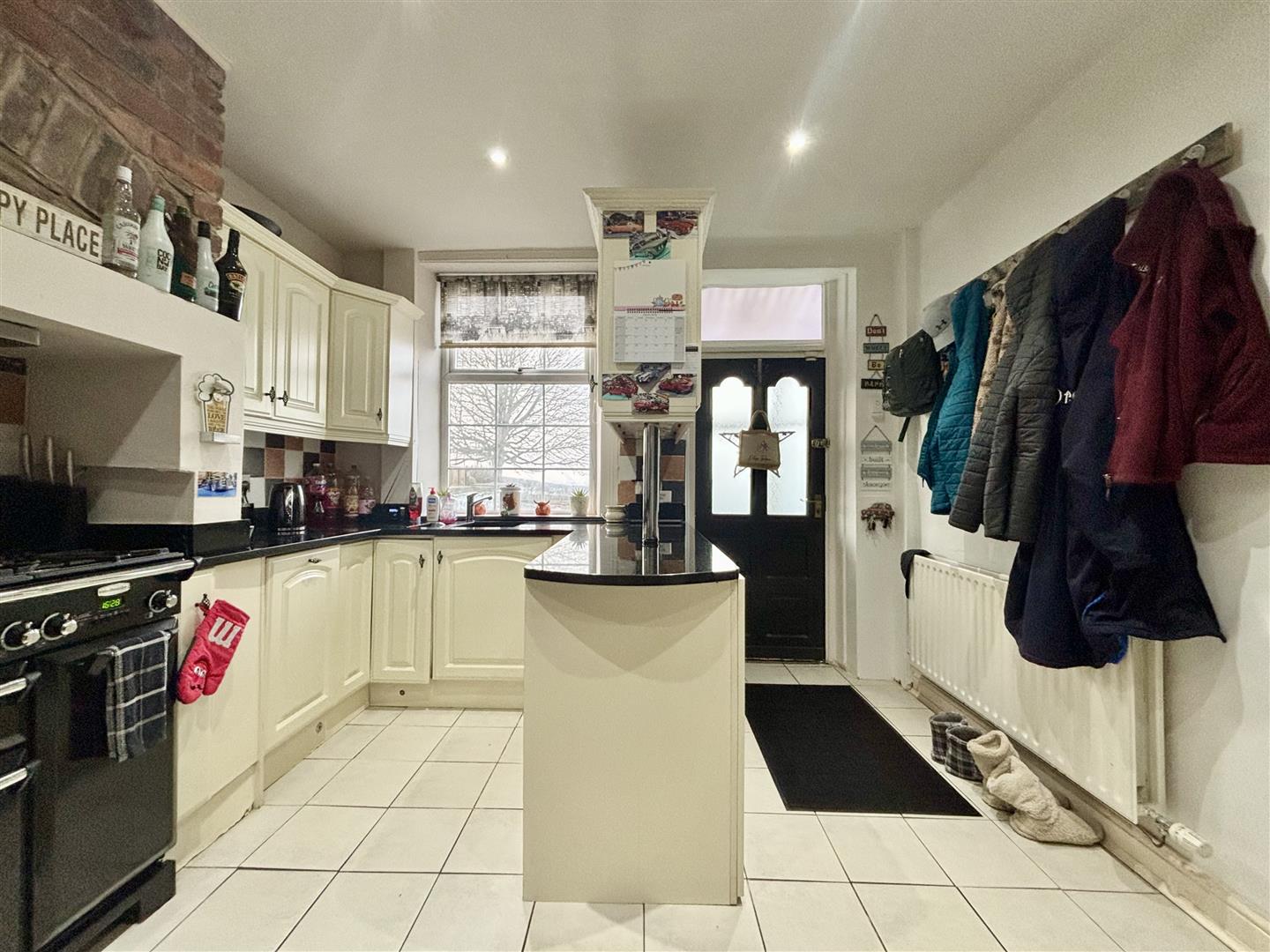 Fitted with a range of base and wall units, granite work surfaces and splash-back wall tiling. Range oven with five gas rings, two ovens and a grill, plus an integrated dishwasher and fridge. Window to the front elevation, stairs to the first floor and doors off to the cellar, front porch and double doors to the lounge. Tiled floor and a central heating radiator. Cellar head area providing further storage.