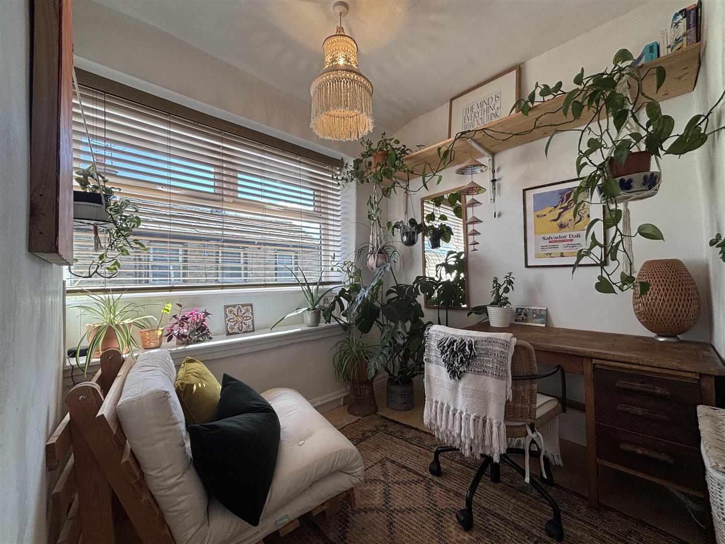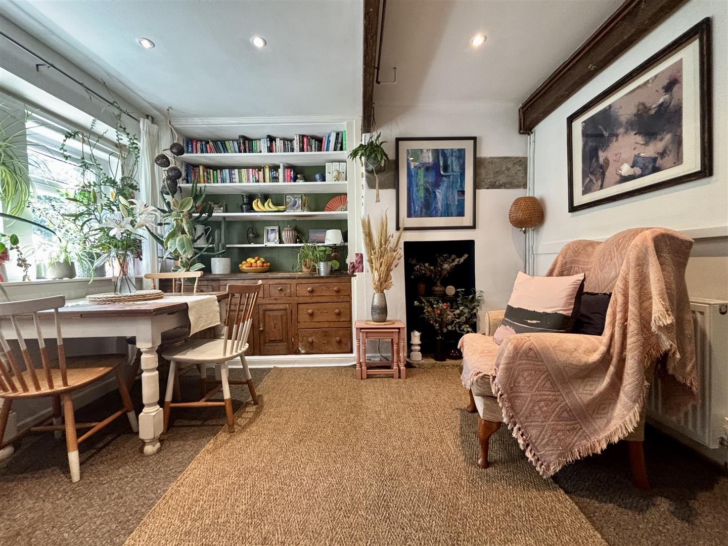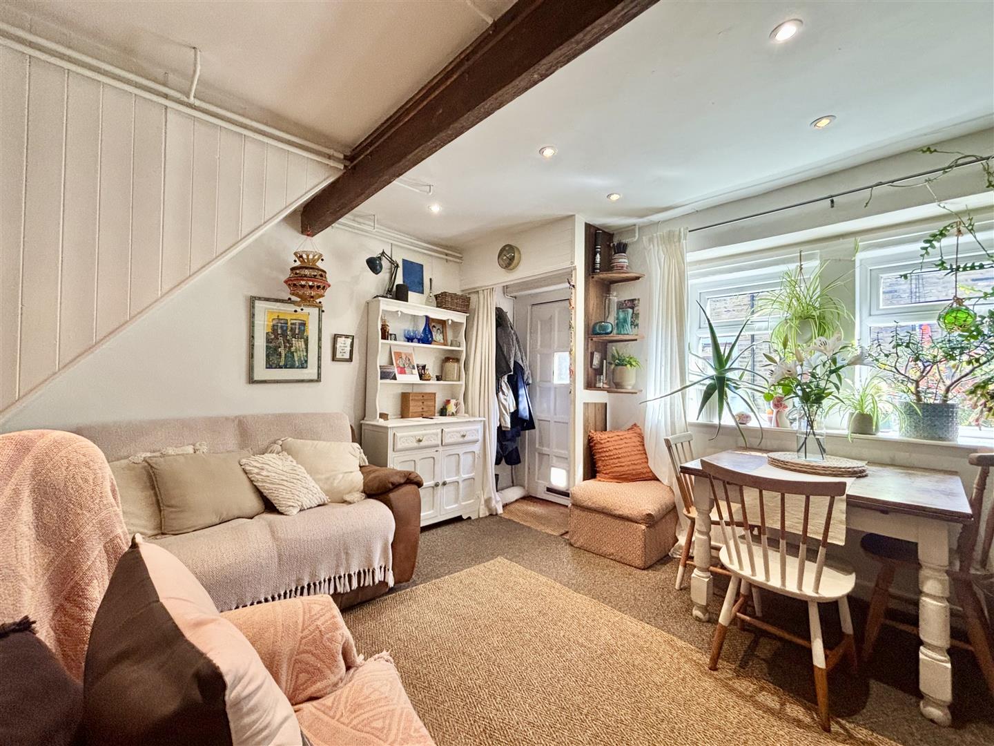 A really cosy, characterful reception room with interesting features such as exposed beams, fitted dresser with storage & open shelving and the original fireplace recess. There are inset spotlights to the ceiling, a central heating radiator, stove style electric fire and a window to the front elevation.