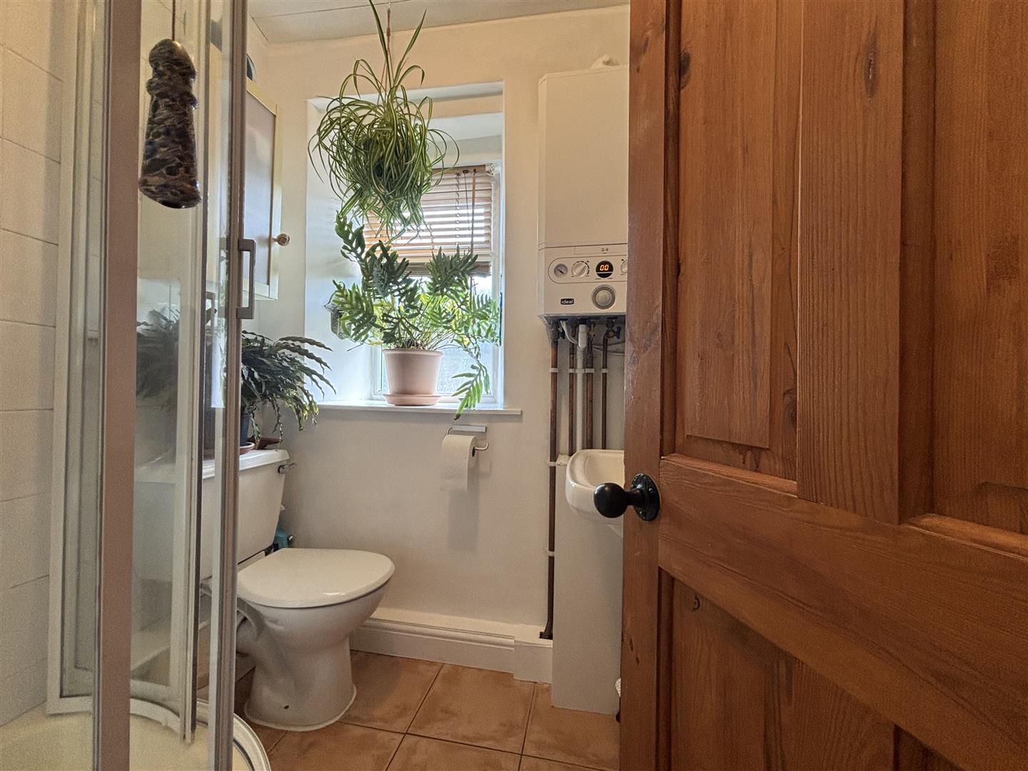 Corner shower with glass sliding doors and a mains powered shower, pedestal washbasin and a low flush WC. Central heating boiler (Ideal Combi) and a window to the front elevation.