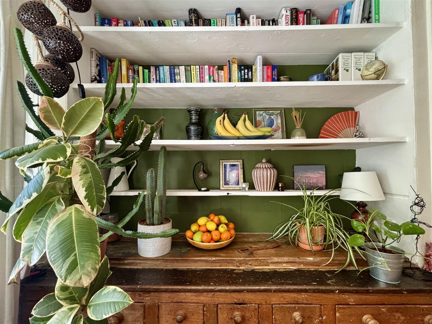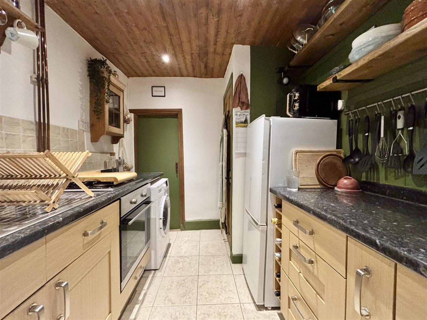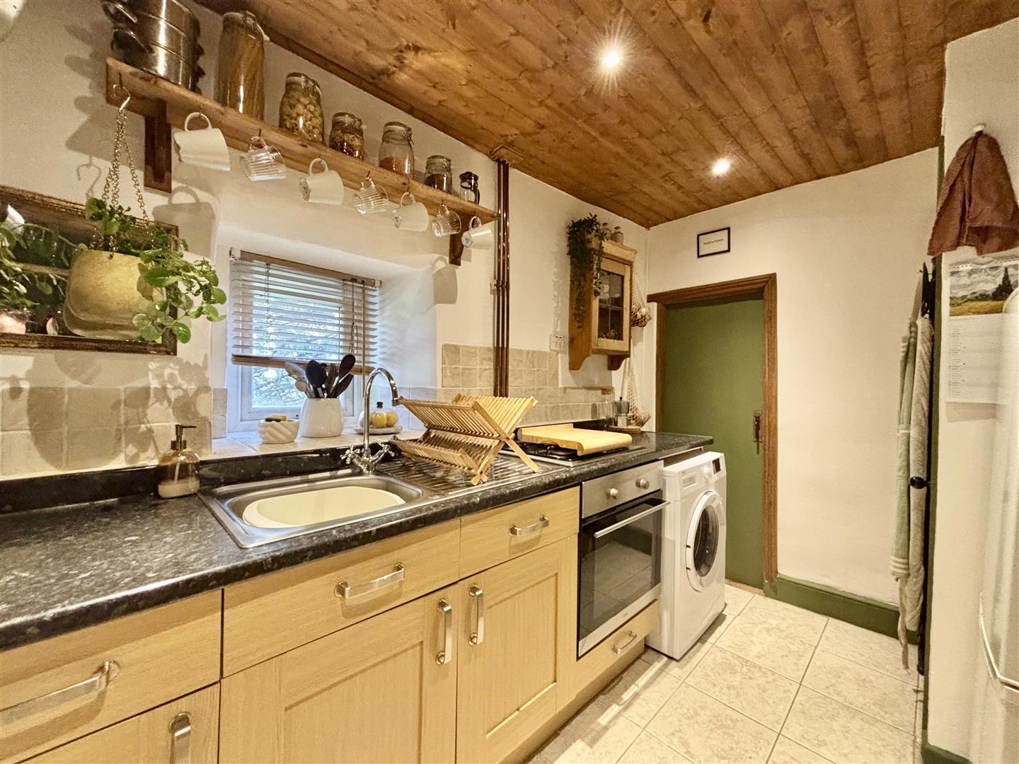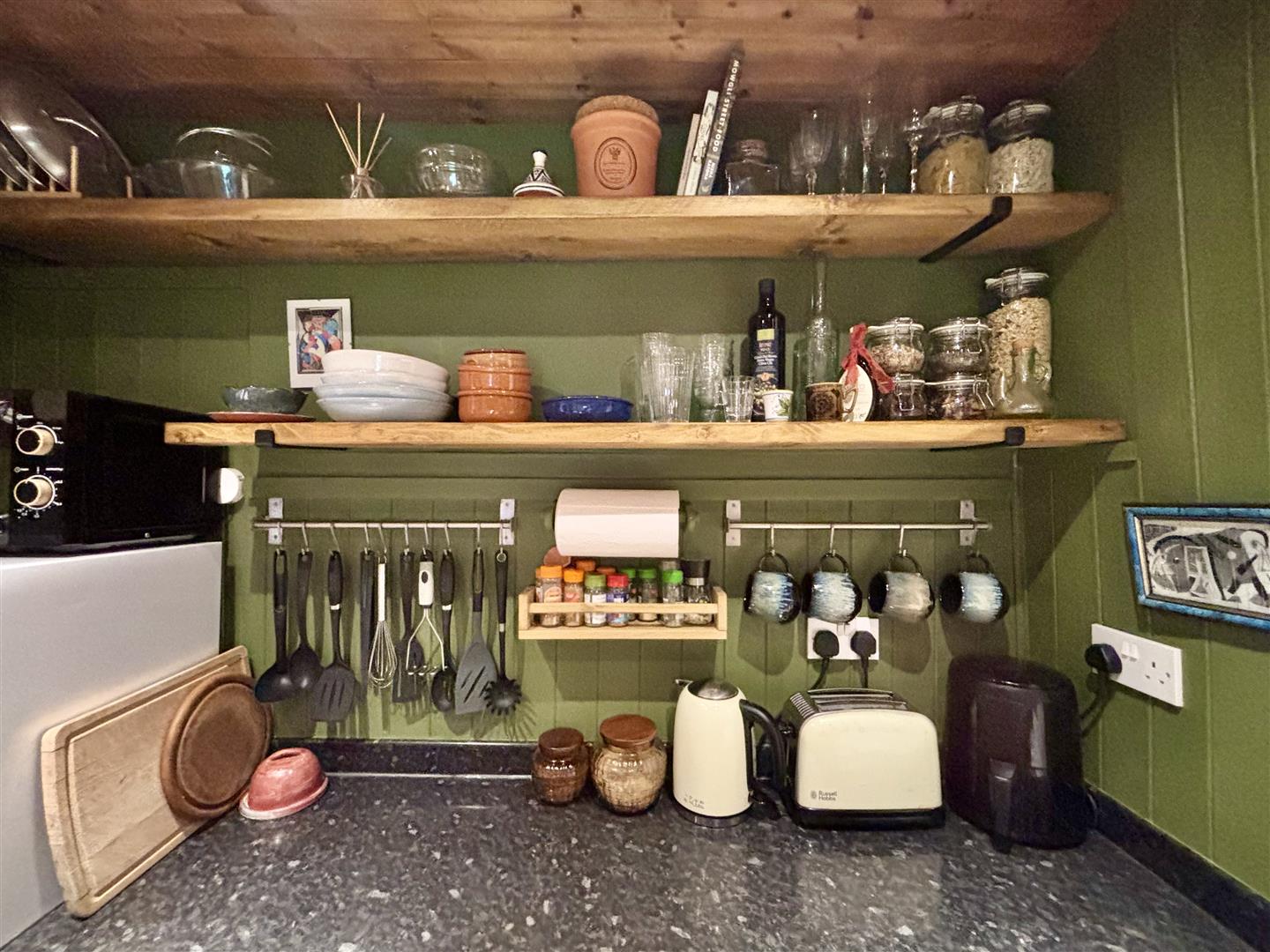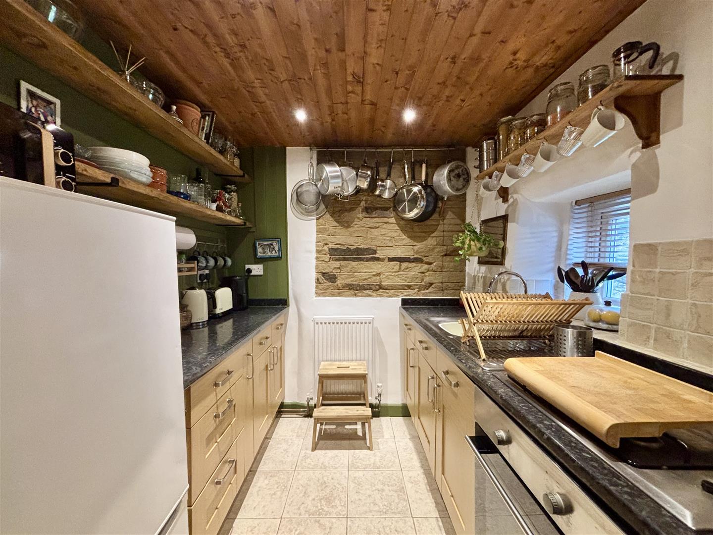 A quirky, characterful kitchen incorporating a range of fitted base units with work surfaces over, rustic open shelving, exposed stone work and a window to the rear elevation. There is an integrated electric oven, gas hob, plumbing for a washing machine and space for a fridge-freezer. Spotlights to the ceiling, central heating radiator and a door to the cellar.