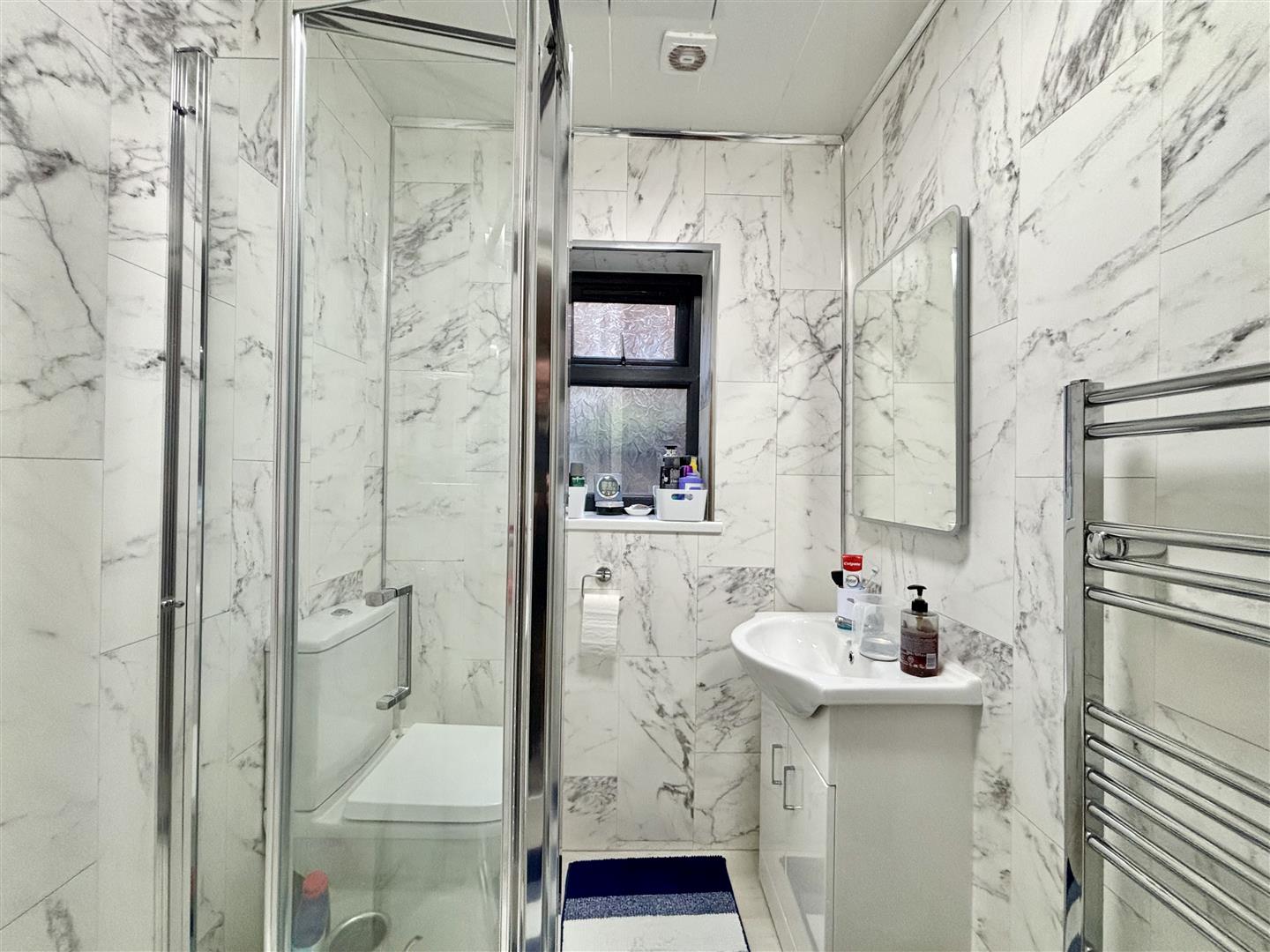 Double width shower cubicle with a mains powered shower, large washbasin with storage below and a low flush WC. LED wall mirror, extractor fan and a window to the side elevation.