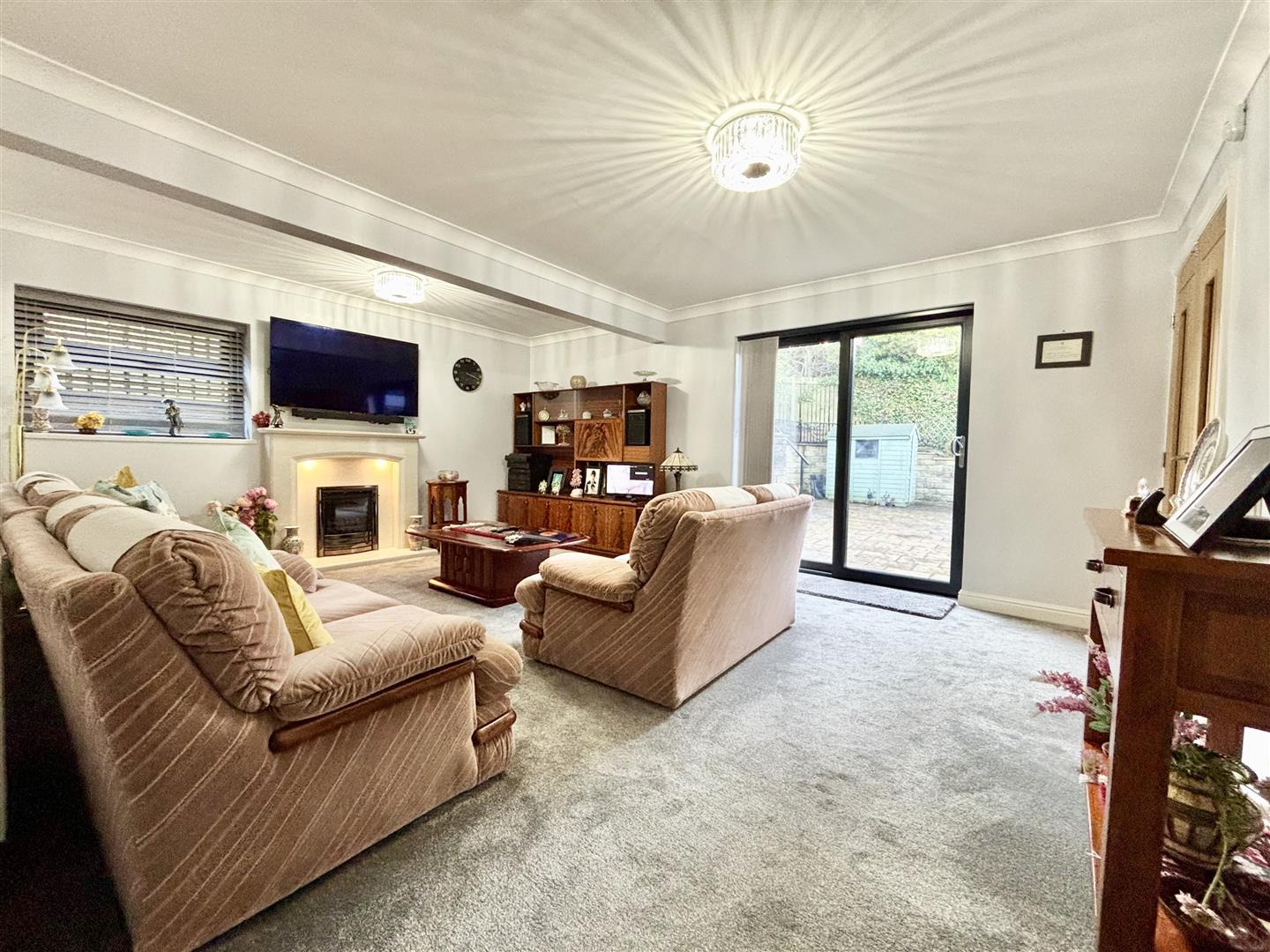 A spacious living room, great for entertaining and fitted with a new marble fireplace with motion sensor down lighting and a glass fronted living flame gas fire. Window to the side elevation, patio doors to the rear garden and two central heating radiators. Door to: