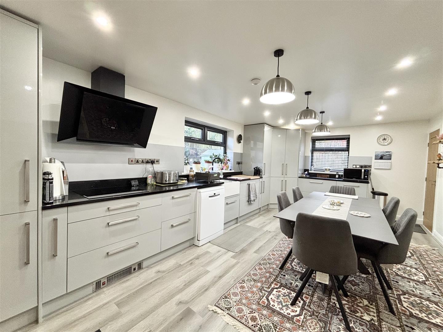 A most impressive dining kitchen with a large range of fitted cabinetry to include wall and base cupboards, corner larder unit, pull-out larder cupboard, pan drawers and black granite working surfaces incorporating a Belfast sink with pot washer tap. Integrated induction hob with matching black glass extractor above, plumbing for a dishwasher and space for a large fridge-freezer with water supply attachment. Windows to the side and rear elevation, laminate flooring, wall TV point, two plinth heaters and a central heating radiator. Door to: