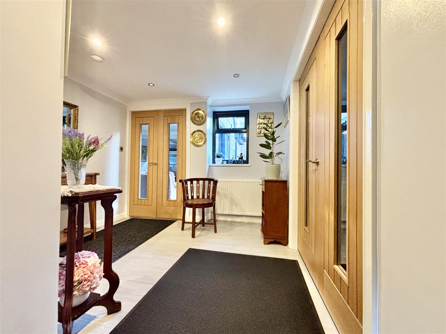 A composite entrance door leads in to a spacious and welcoming hallway with ample space for coats and shoes, double doors off to the lounge and dining kitchen, window to the rear elevation and laminate flooring. Central heating radiator.