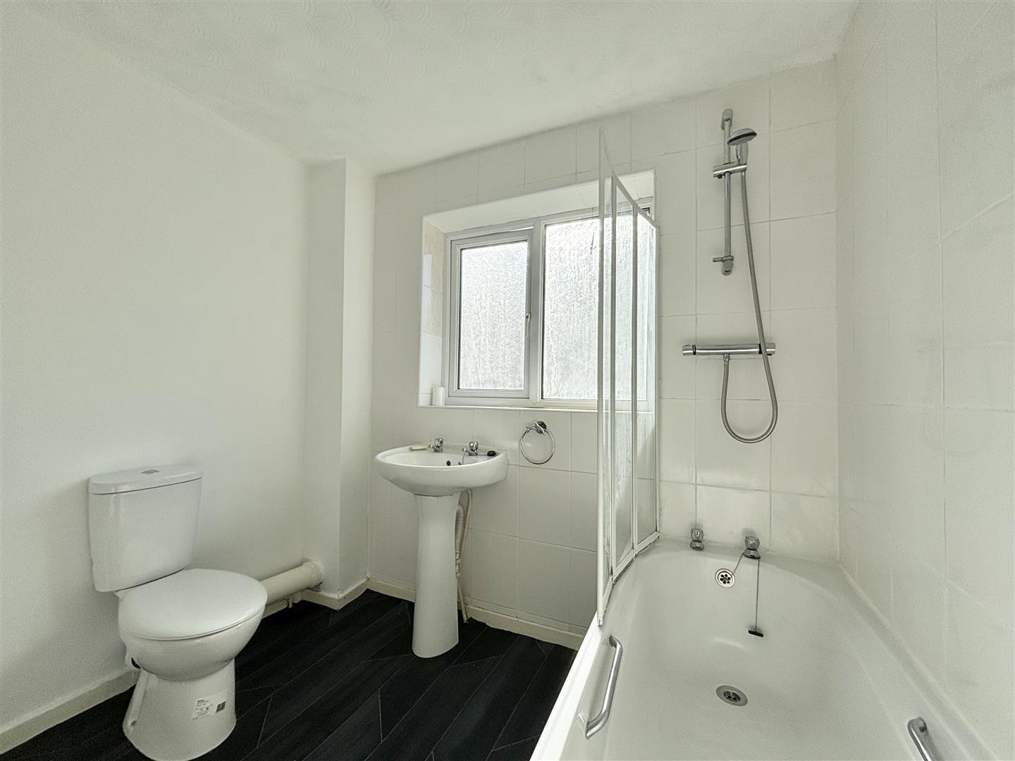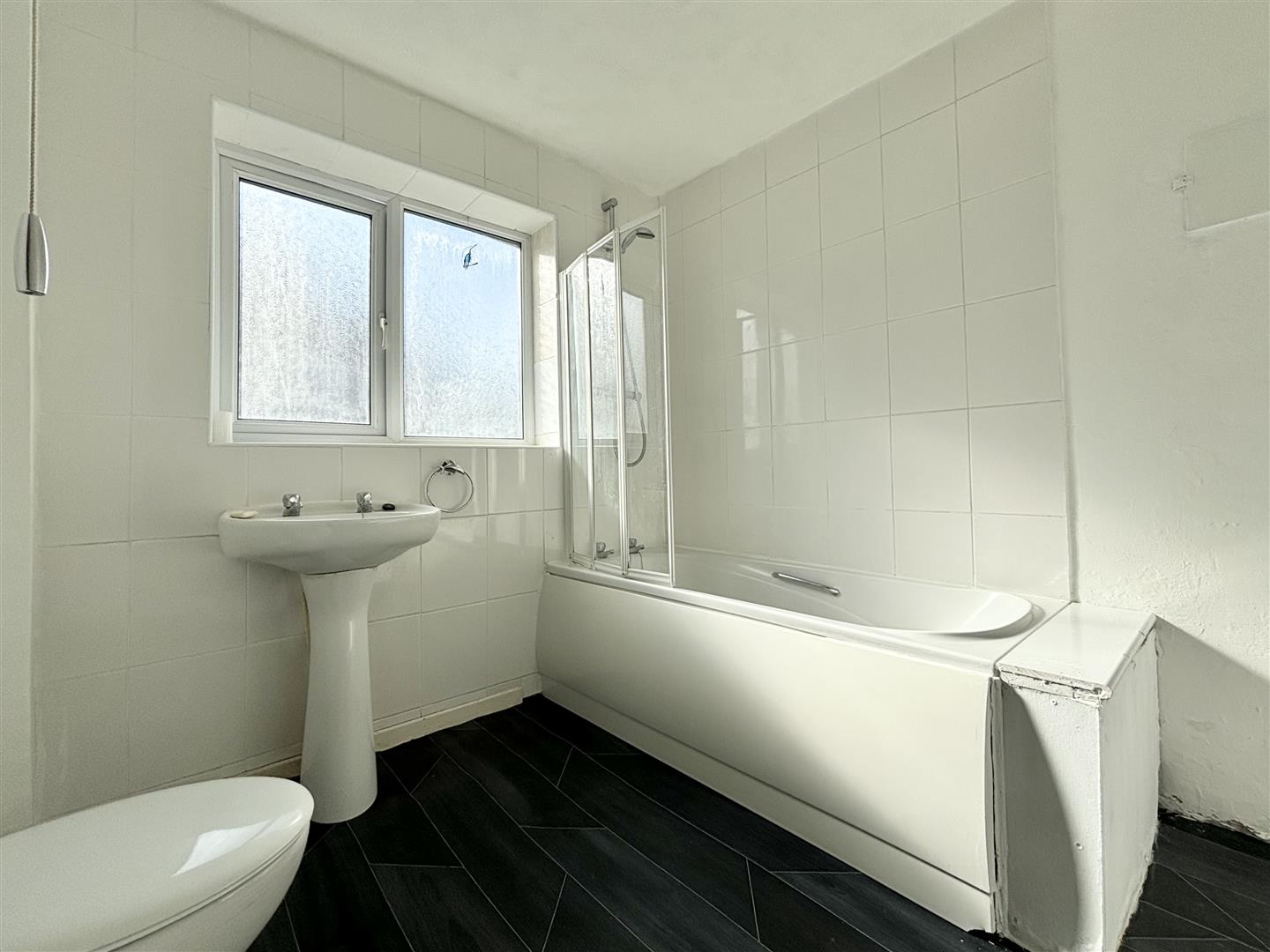 A family bathroom comprising of a panelled bath with mains powered shower over, pedestal washbasin and a low flush WC. Part-tiled wall, window to the side elevation and a chrome heated towel rail.