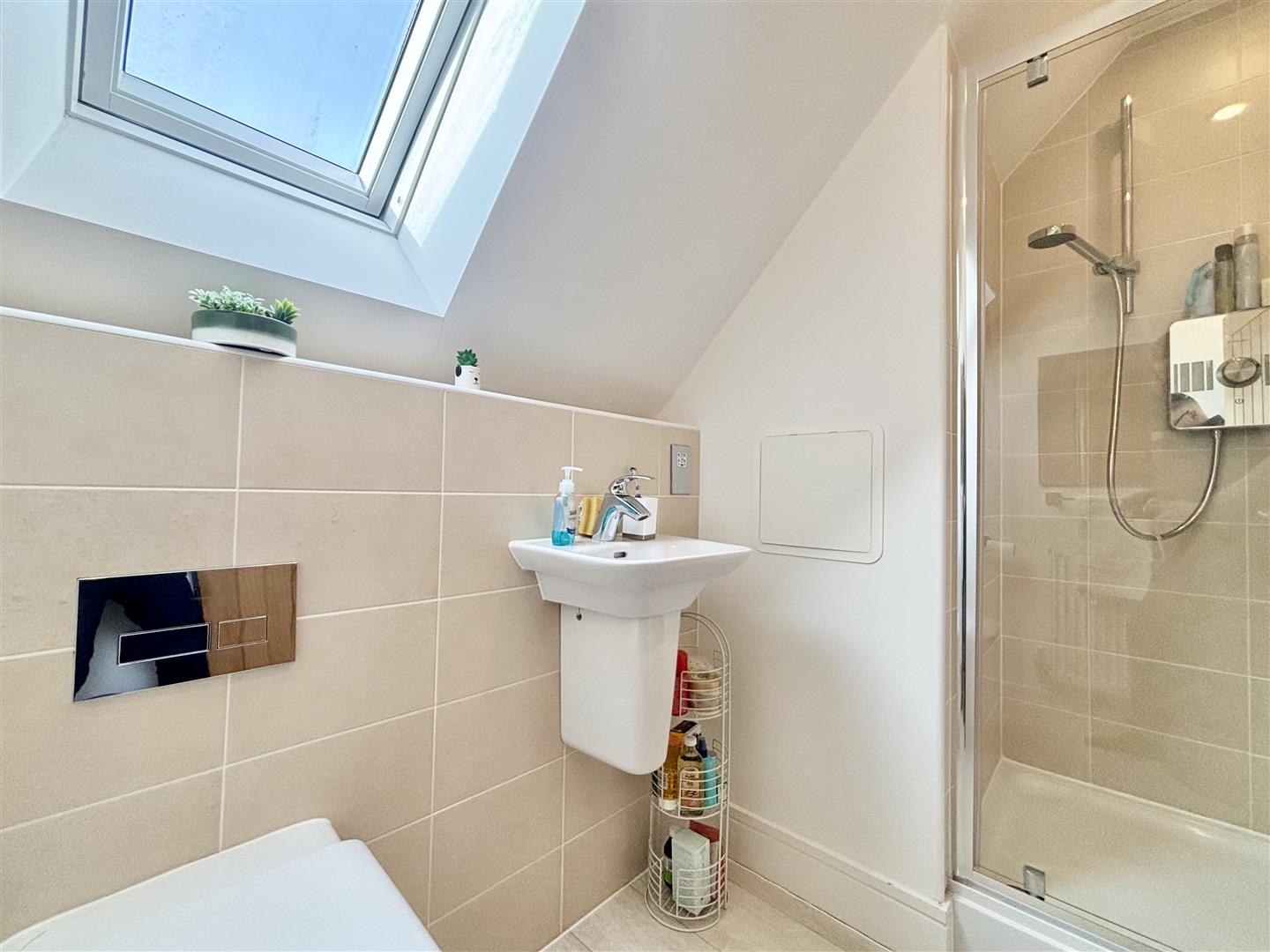 Shower cubicle with glass door and an electric shower, floating WC, wall mounted washbasin, roof window and a central heating radiator.