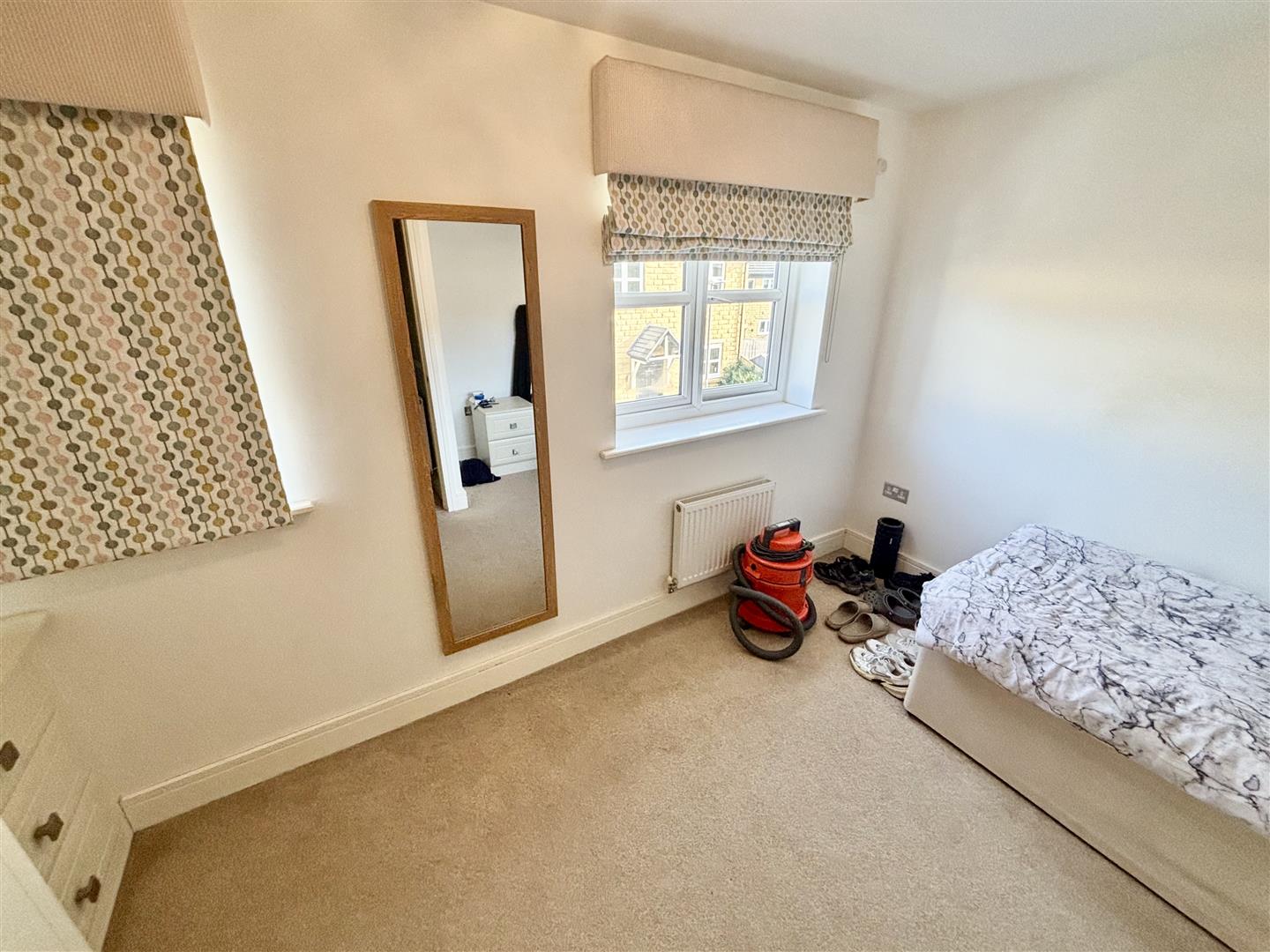 Dormer window to the front elevation, double fitted wardrobe with mirror sliding doors, loft hatch and a central heating radiator.