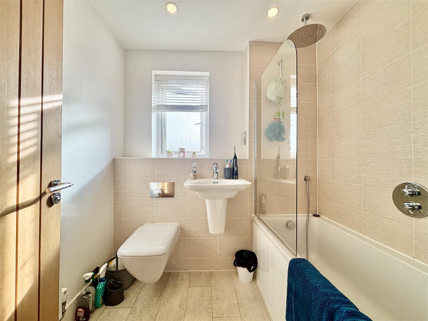 Family bathroom comprising of a panelled bath with rainfall shower over, floating WC and a wall mounted washbasin. Window to the side elevation, extractor and a central heating radiator.