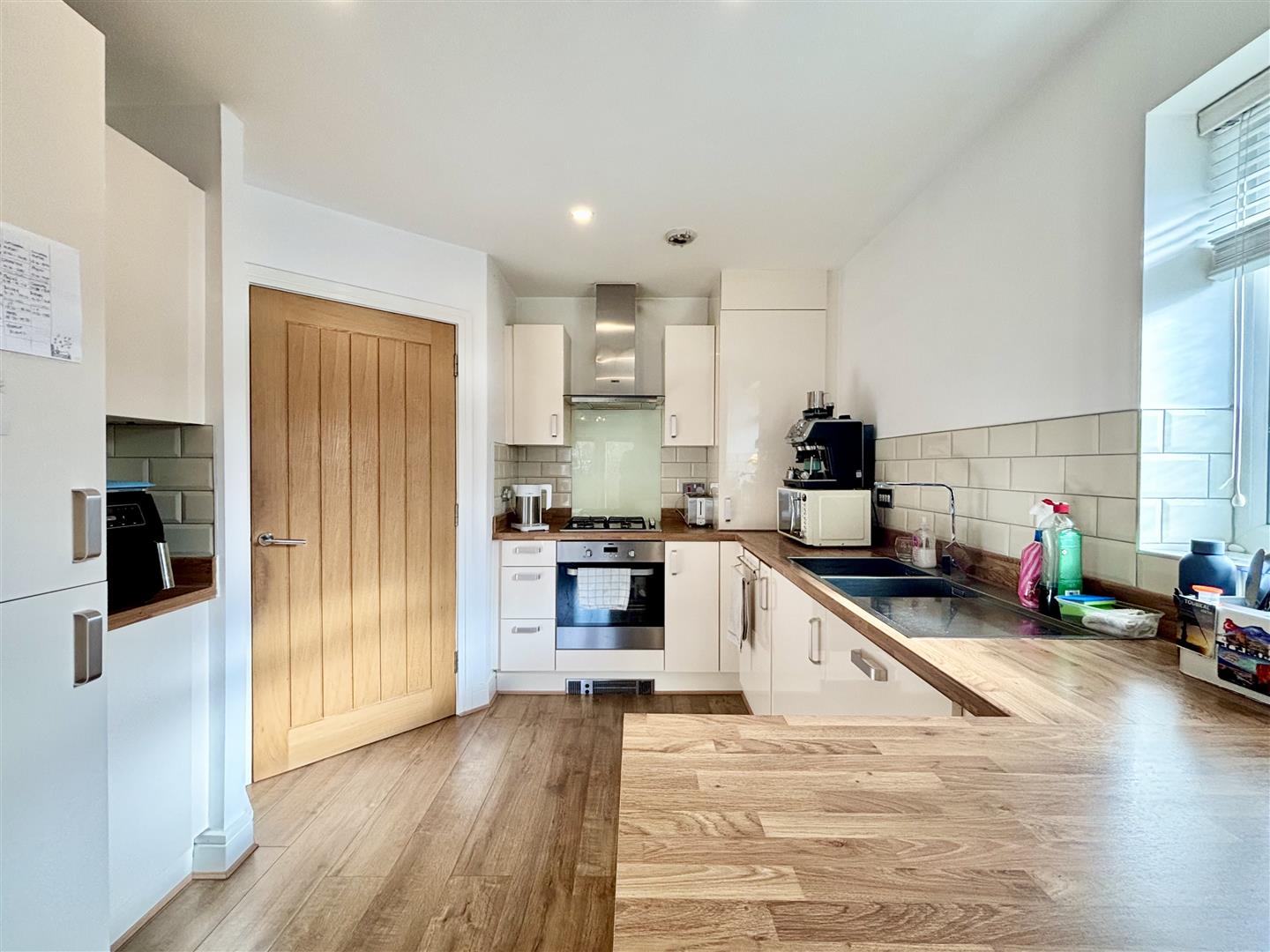Fitted with a good range of base and wall units, laminate work surfaces and splash-back wall tiling. Integrated appliances include a dishwasher, washer-dryer, fridge-freezer, electric oven, gas hob and an extractor above. Window to the side elevation, stainless steel sink & drainer and a useful pantry/under-stairs store. Being open plan to: