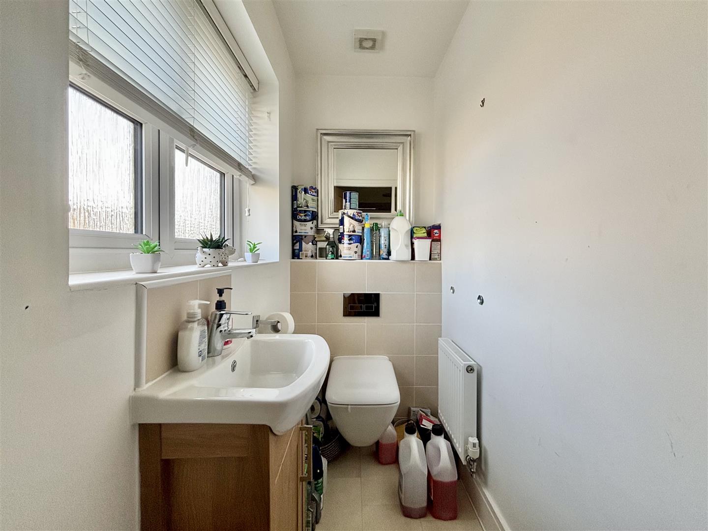 Ground floor cloakroom consisting of a floating WC, washbasin with storage below and a window to the front elevation. Central heating radiator.