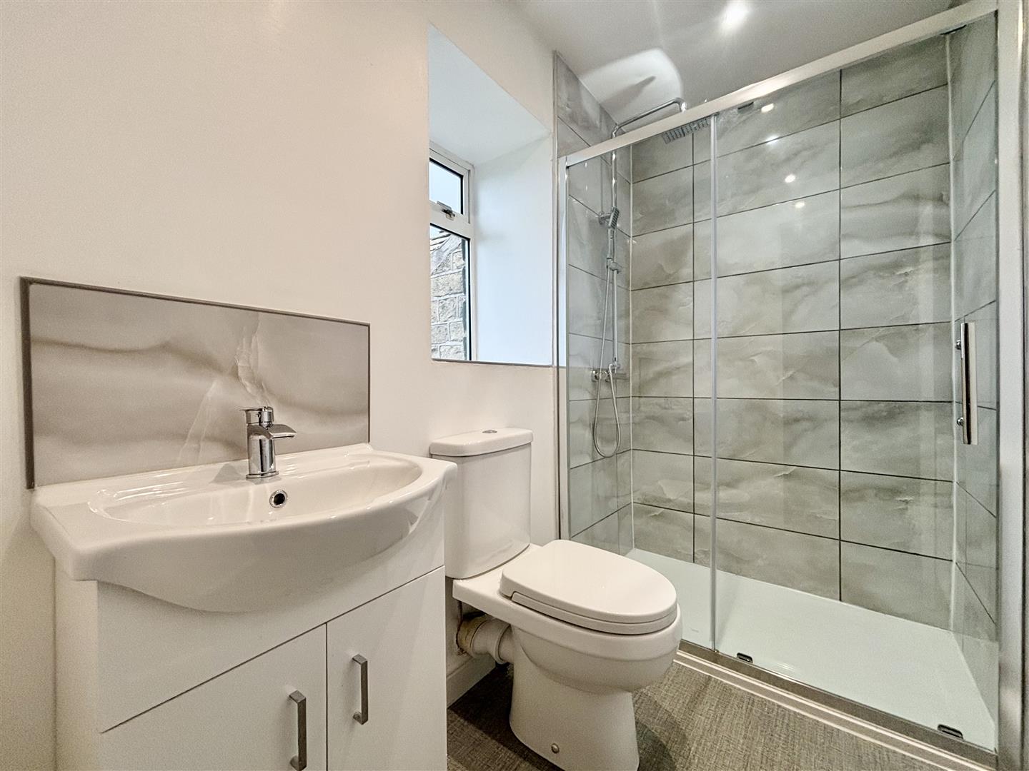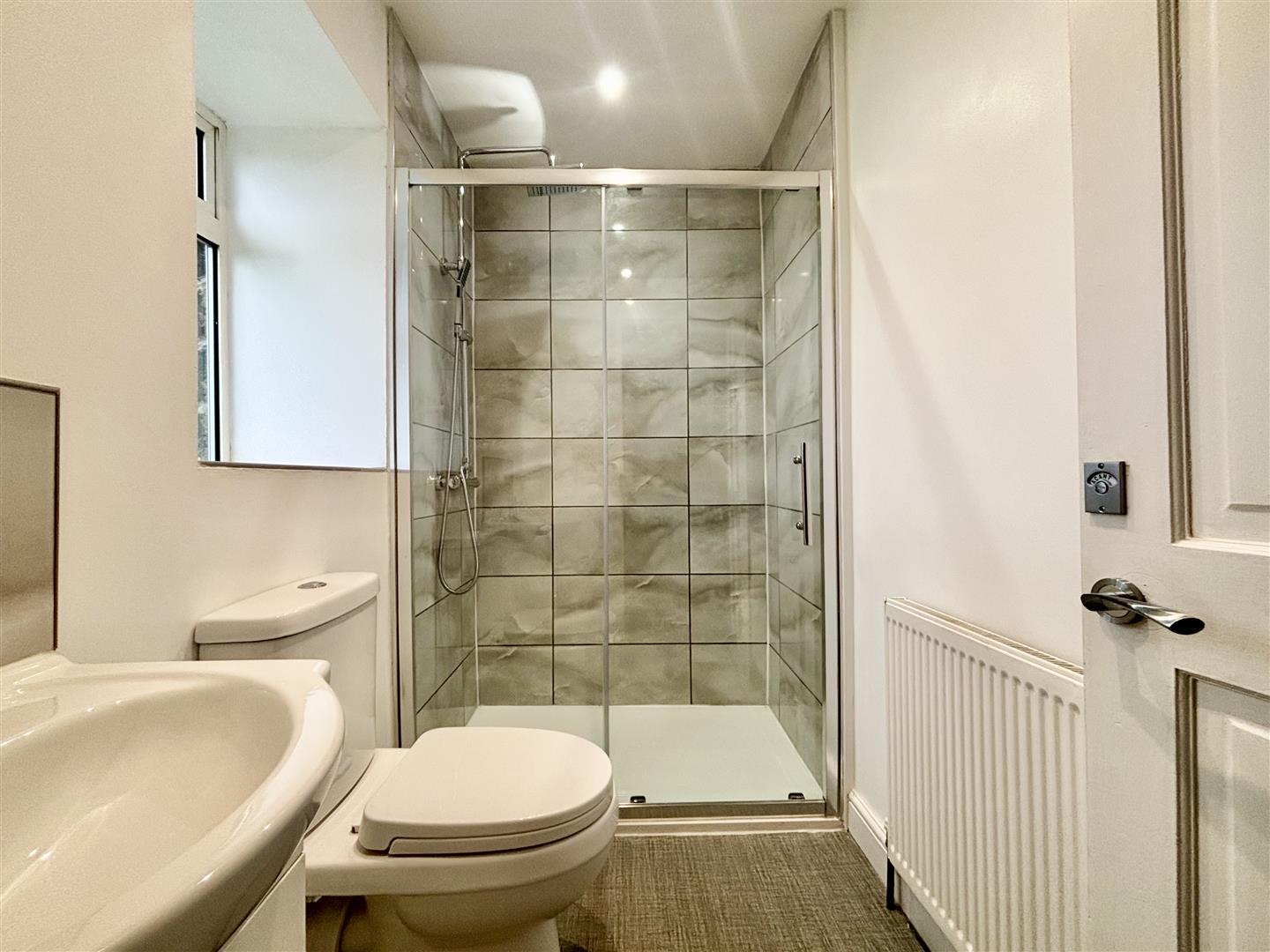A fully refurbished shower room consisting of a large walk-in shower with glass door and a rainfall shower, washbasin with storage below and a low flush WC. Central heating radiator and a window to the rear enjoying stunning long range views across farmland.
