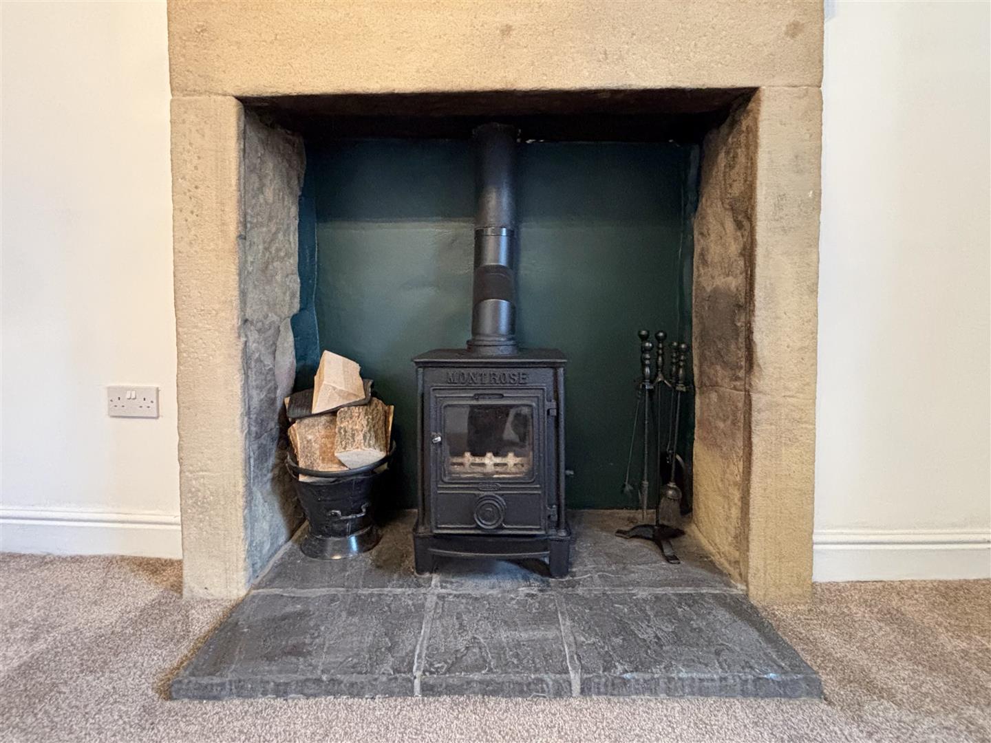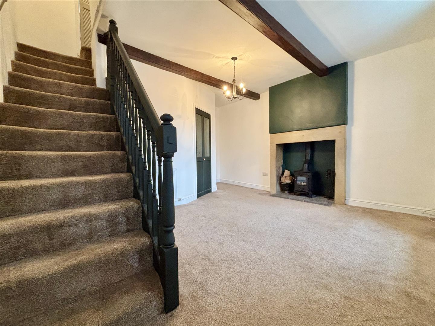 A spacious and characterful reception room with exposed stone fireplace, solid fuel stove and exposed beams. Stairs lead off to the first floor, window to the front elevation, two central heating radiators and a door to the kitchen.