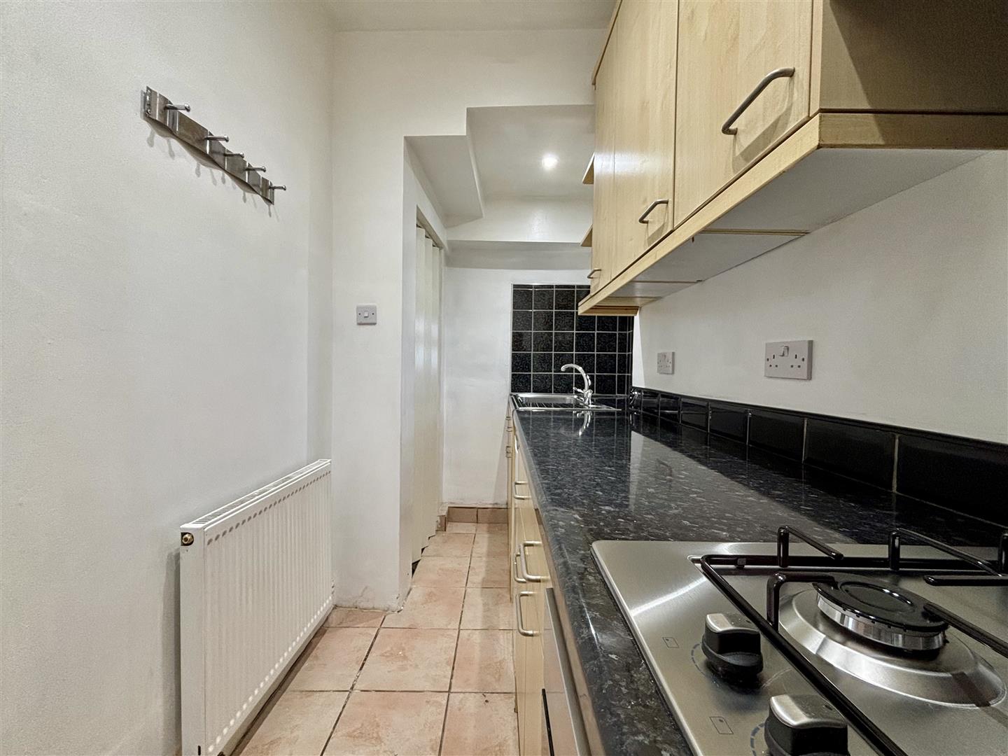 A galley kitchen fitted with a range of base and wall units, laminated work surfaces and splash-back tiling. Brand new integrated electric oven and gas hob with an extractor over. Tiled floor, central heating radiator, window to the rear and a door to the cellar.