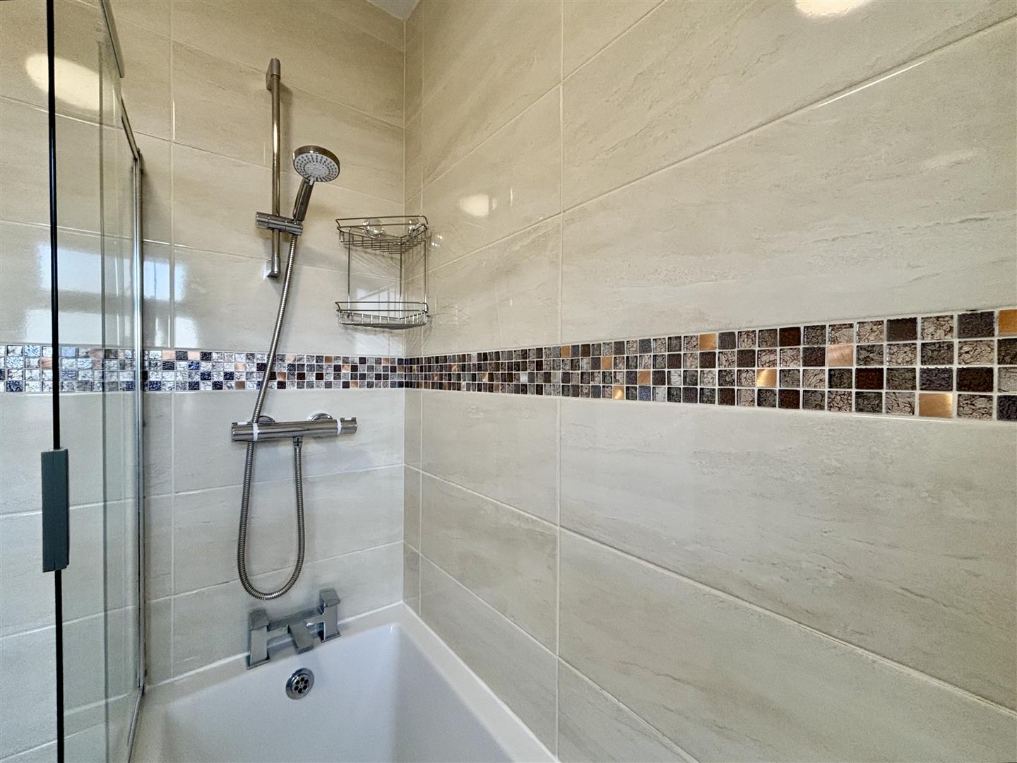 A modern refurbished bathroom with quality three piece suite comprising of a panelled bath with a mains powered shower over, wall mounted washbasin and a low flush WC. Window to the rear elevation, extractor and a heated towel rail.
