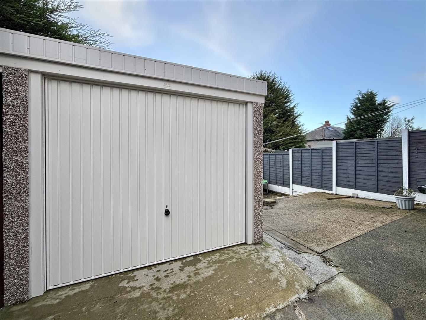 Modern detached single garage with power and light, 'up and over' door to the front, side entrance door and a UPVC window.