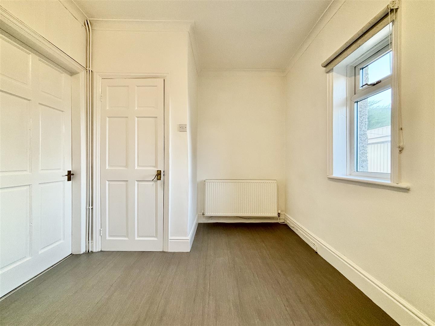 Window to the front elevation and a central heating radiator. Three large matching double wardrobes with drawers below are included in the sale.
