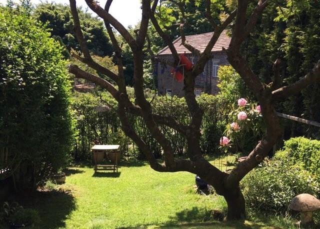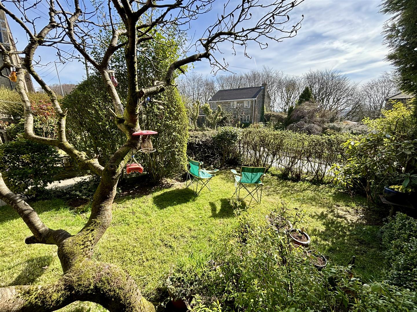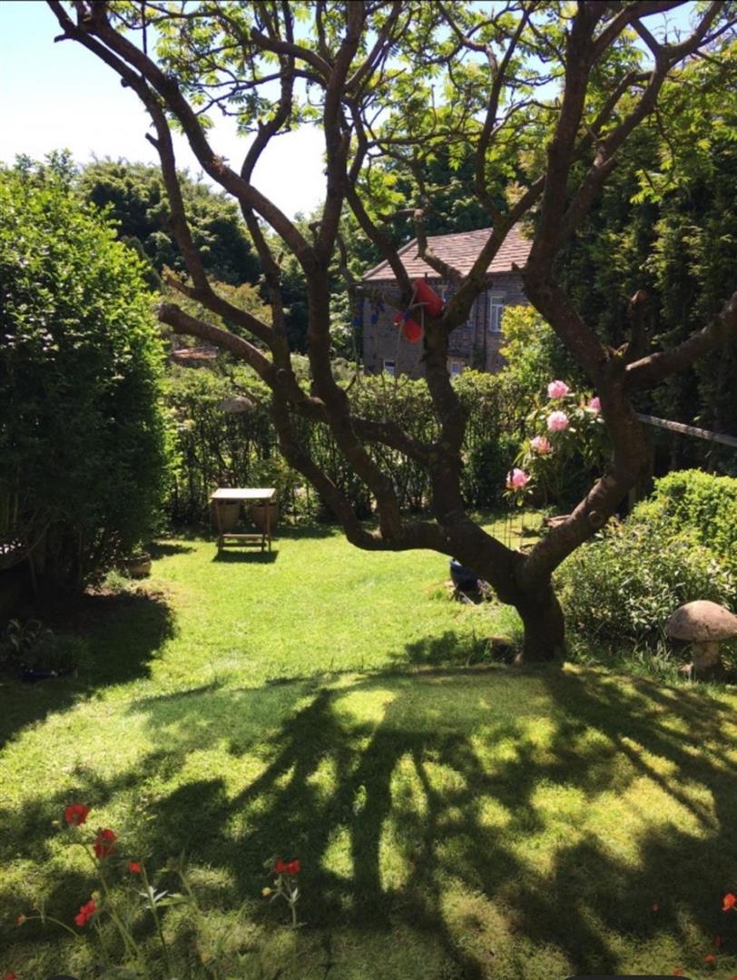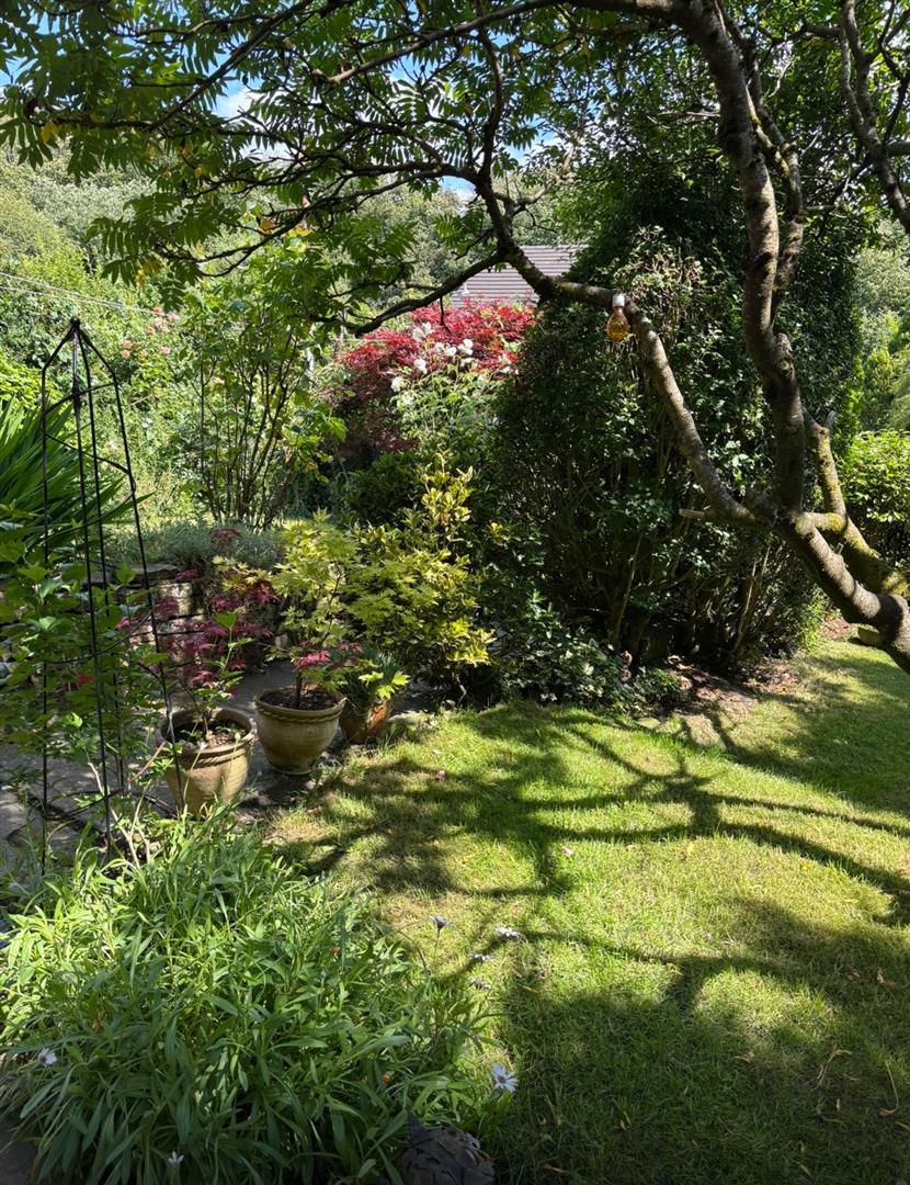 Lawned cottage garden with mature shrubs and trees.