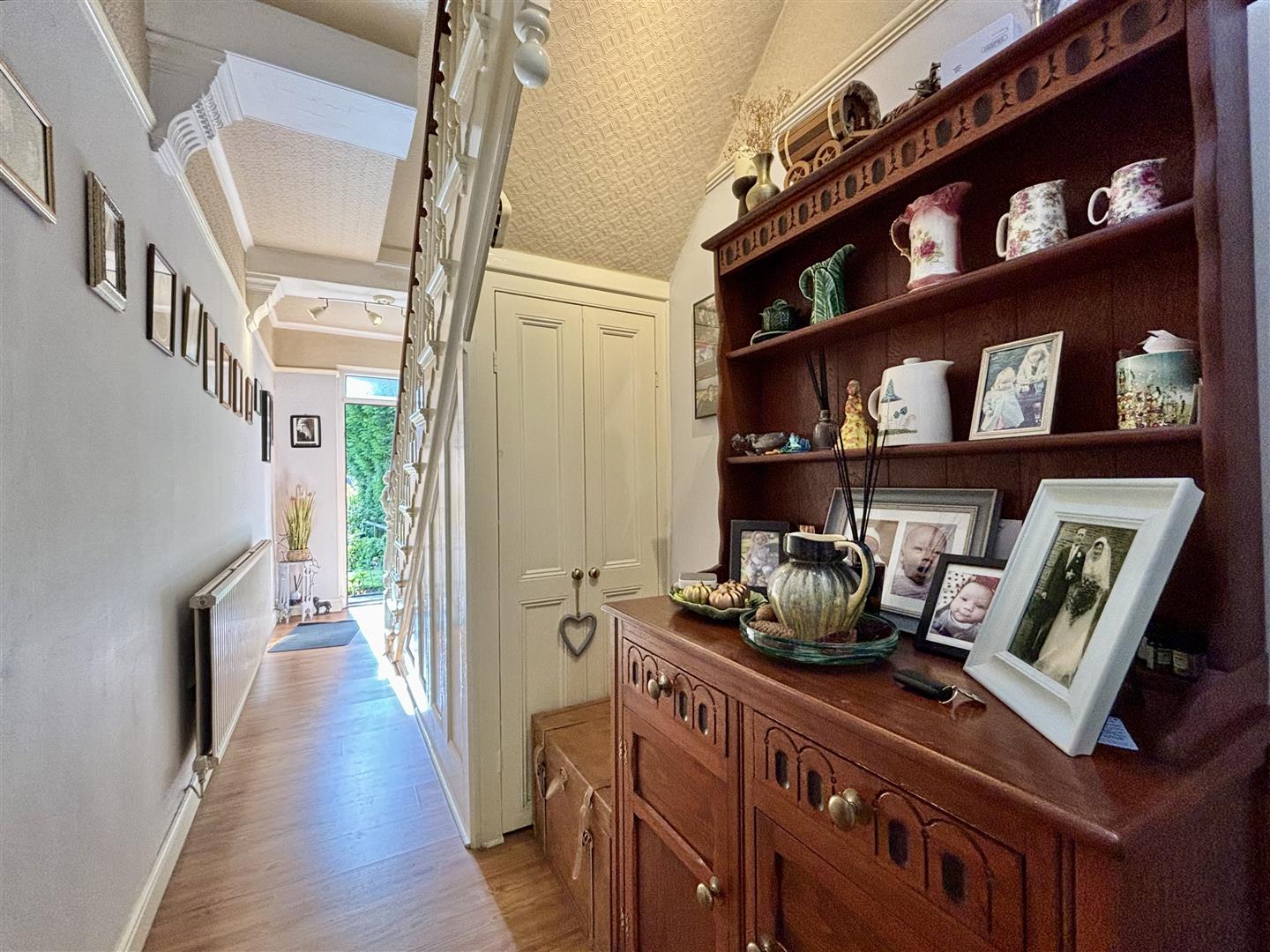 Open spindle staircase to the first floor, ornate plaster work and a central heating radiator.