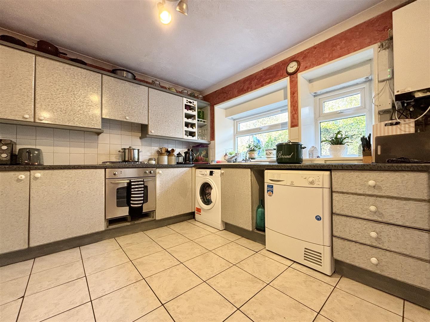 Fitted with wall and base units and laminated working surfaces. Tiled floor, white composite sink and drainer, washing machine plumbing, integrated electric oven and a gas hob. Two windows and a door to the rear.