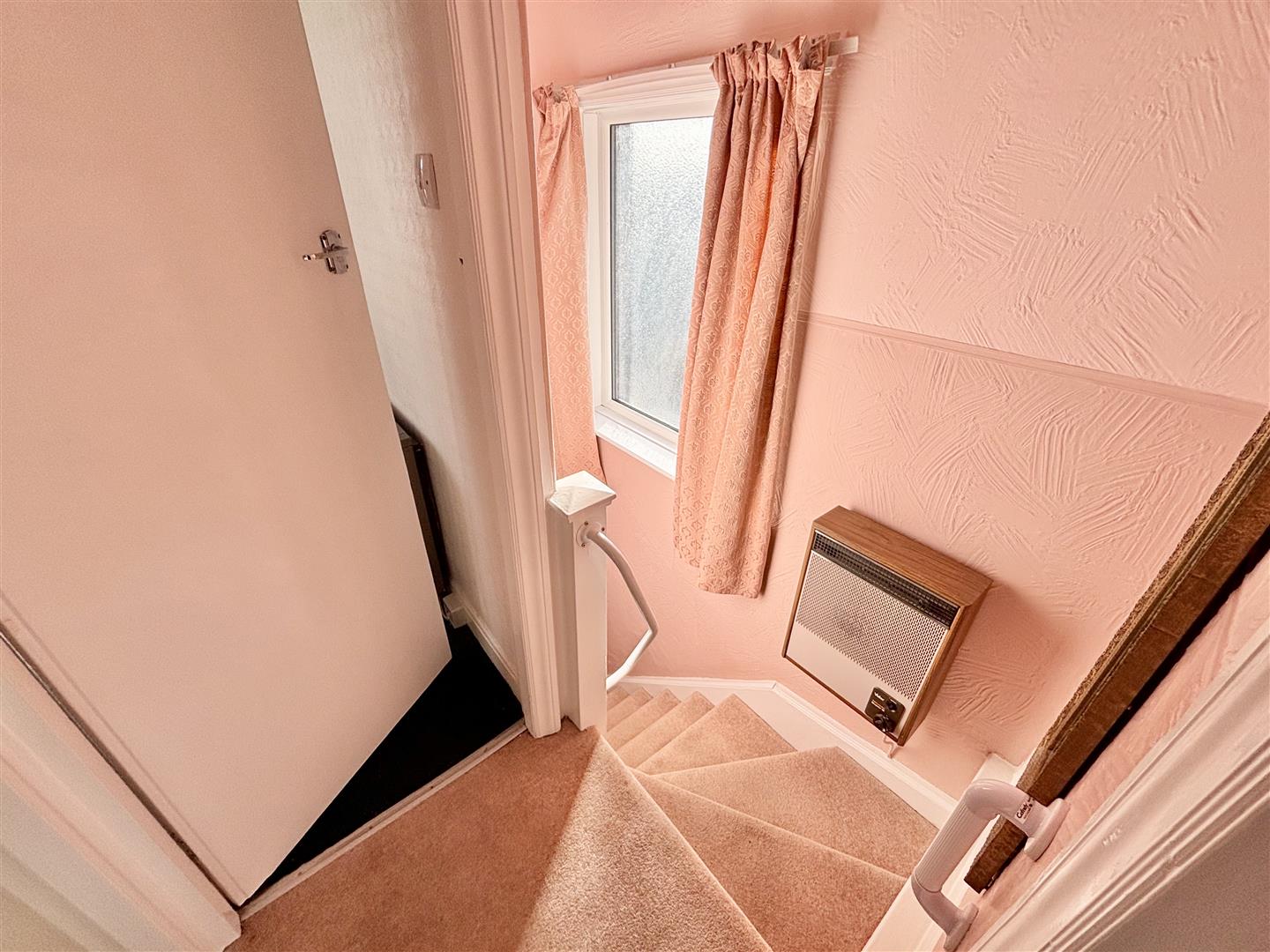 Landing area with a window to the side elevation, gas wall heater, access to the loft space and doors to both bedrooms and the bathroom.