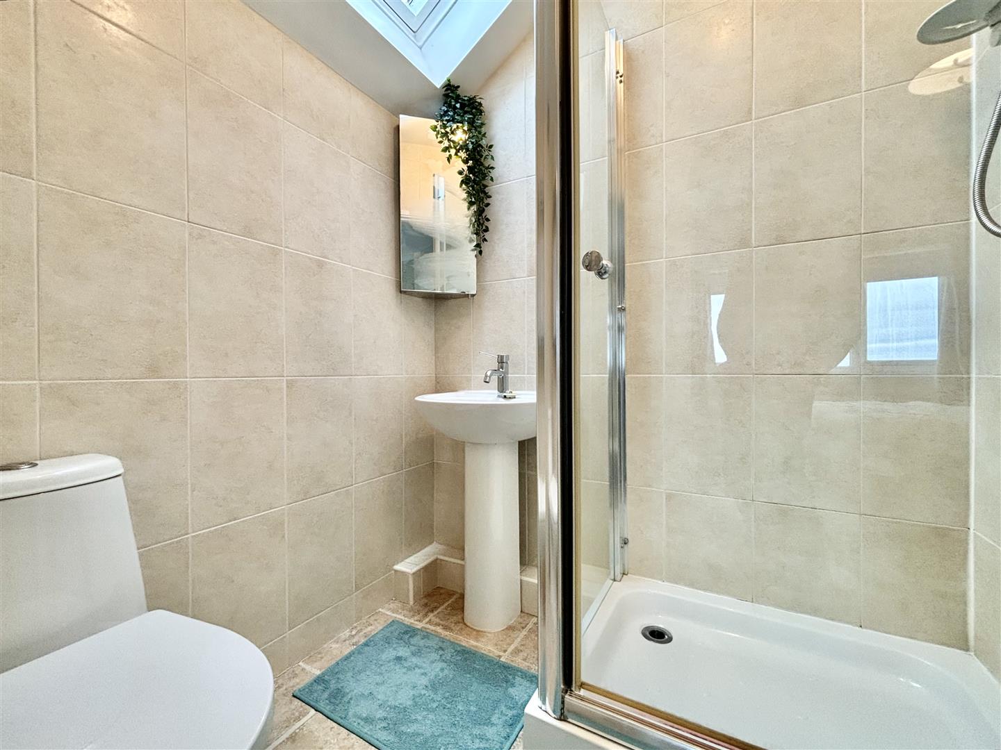 A fully tiled en-suite comprising of a shower cubicle with electric shower, pedestal washbasin and a low flush WC. Velux roof window, chrome heated towel rail and a tiled floor.