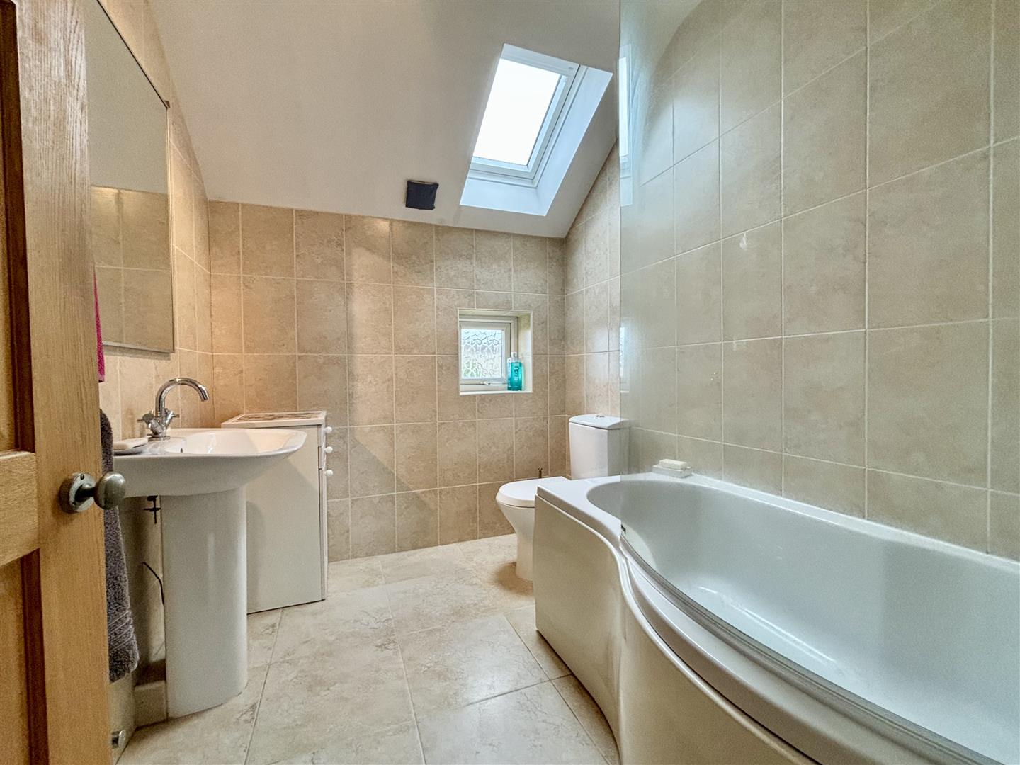 A fully tiled family bathroom comprising of a 'P' shape bath with a mains powered shower over, pedestal washbasin, WC, Velux roof window, chrome heated towel rail and a tiled floor.