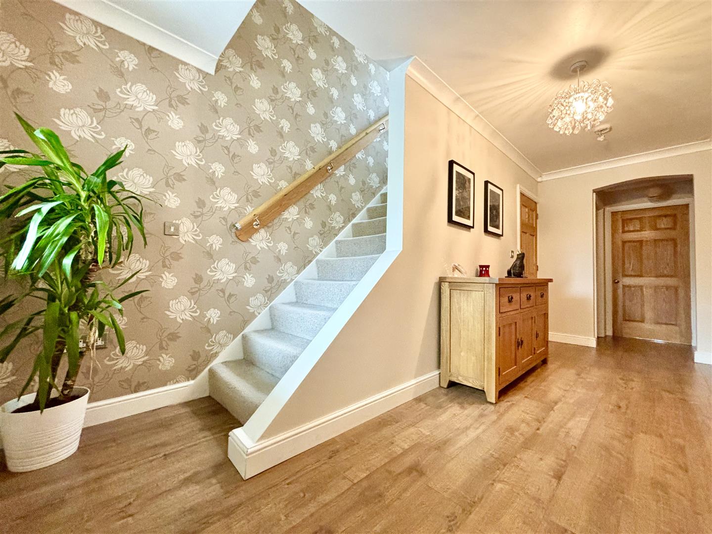 A spacious hall with stairs leading off to the first floor, laminate flooring, central heating radiator and doors to the basement, kitchen, dining room, lounge and WC.