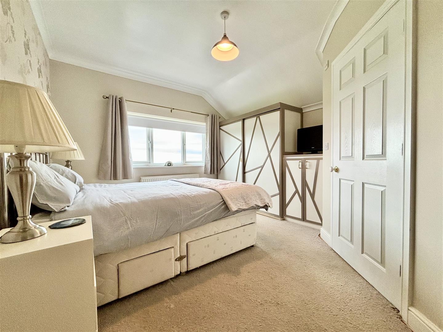 Fitted double wardrobe and matching cabinet, central heating radiator and a window to the rear elevation with open outlook.