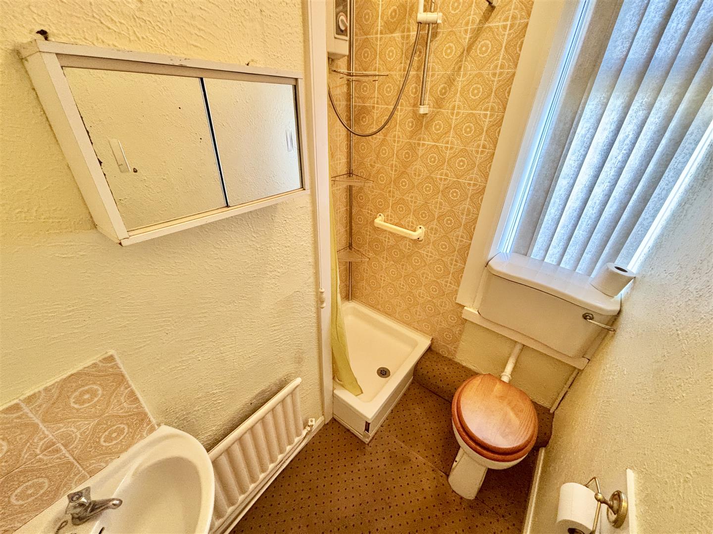 Comprising of a walk-in shower cubicle with an electric shower, washbasin and WC. Window to the front elevation and a central heating radiator.
