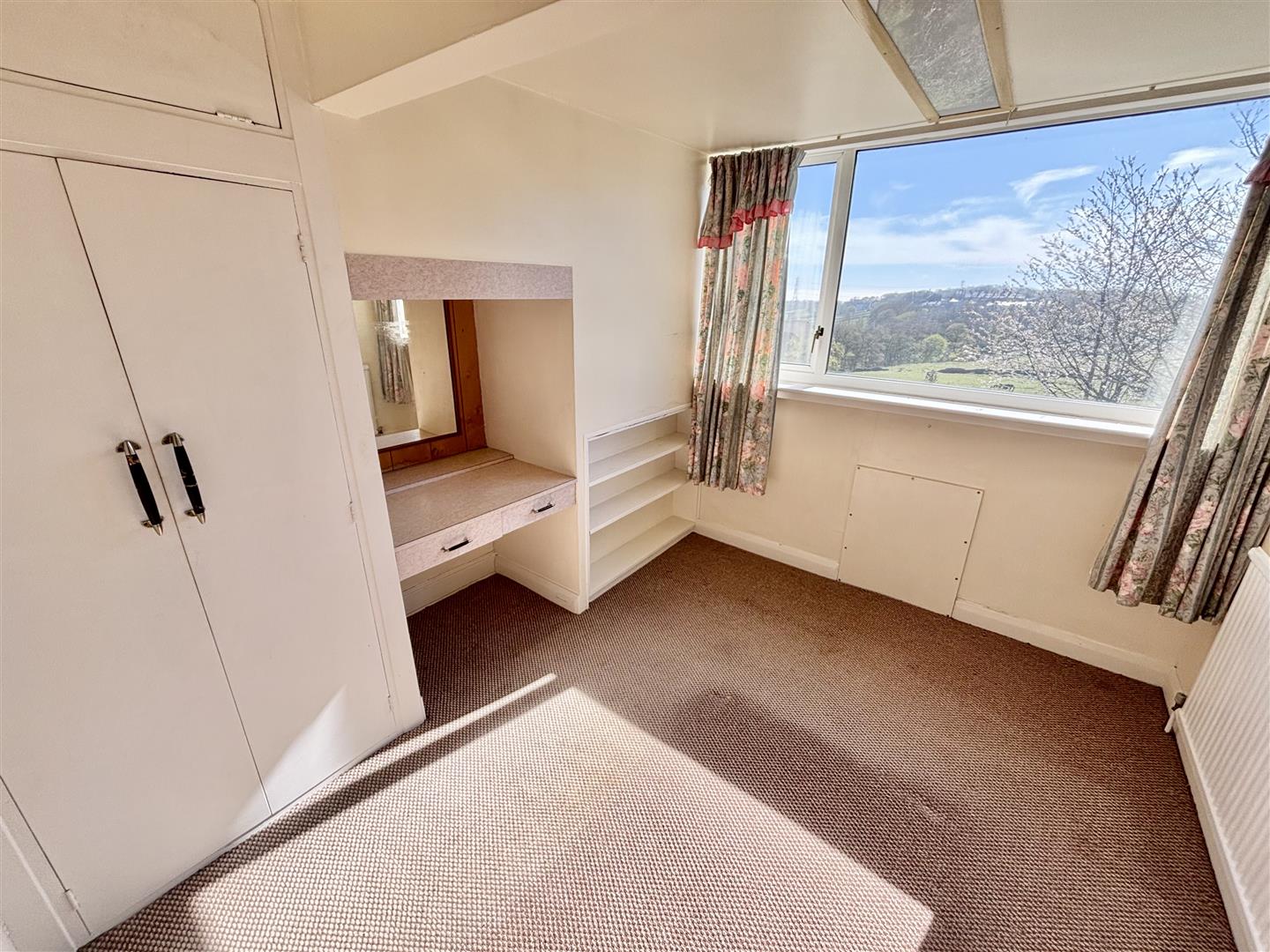 Dorner window to the rear with panoramic views, fitted wardrobe, dressing table and open shelving. Central heating radiator.