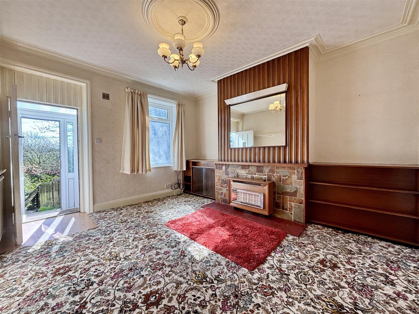 A bright lounge with a feature fireplace and gas fire, central heating radiator, door to the rear porch and a window overlooking the garden.