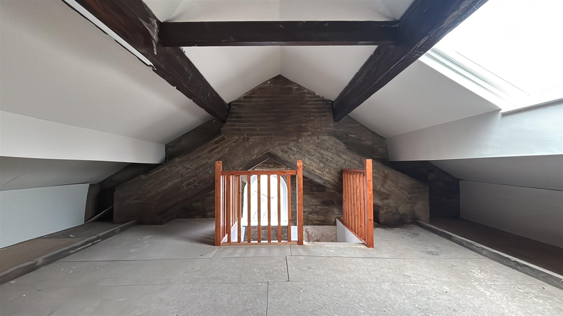 A spacious attic bedroom with exposed beams, feature stone wall and an open spindle balustrade. Velux roof window and an arched window to the side elevation.