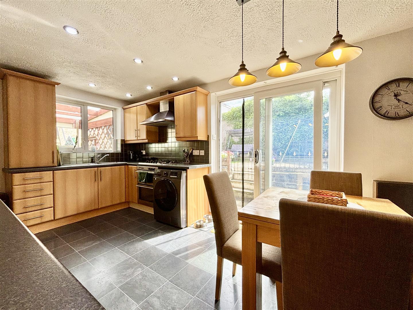 Fitted with a good range of base and wall units included integrated fridge, freezer, dishwasher and washing machine. There is ample space for a dining table and chairs, a useful under-stairs store cupboard, window to the side elevation and sliding patio doors leading out to the rear garden. A fitted cupboard houses the central heating combi boiler (12 month old).