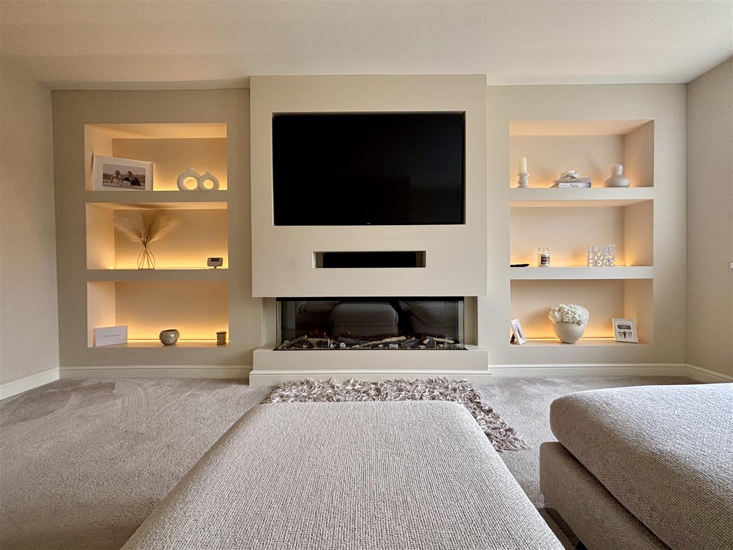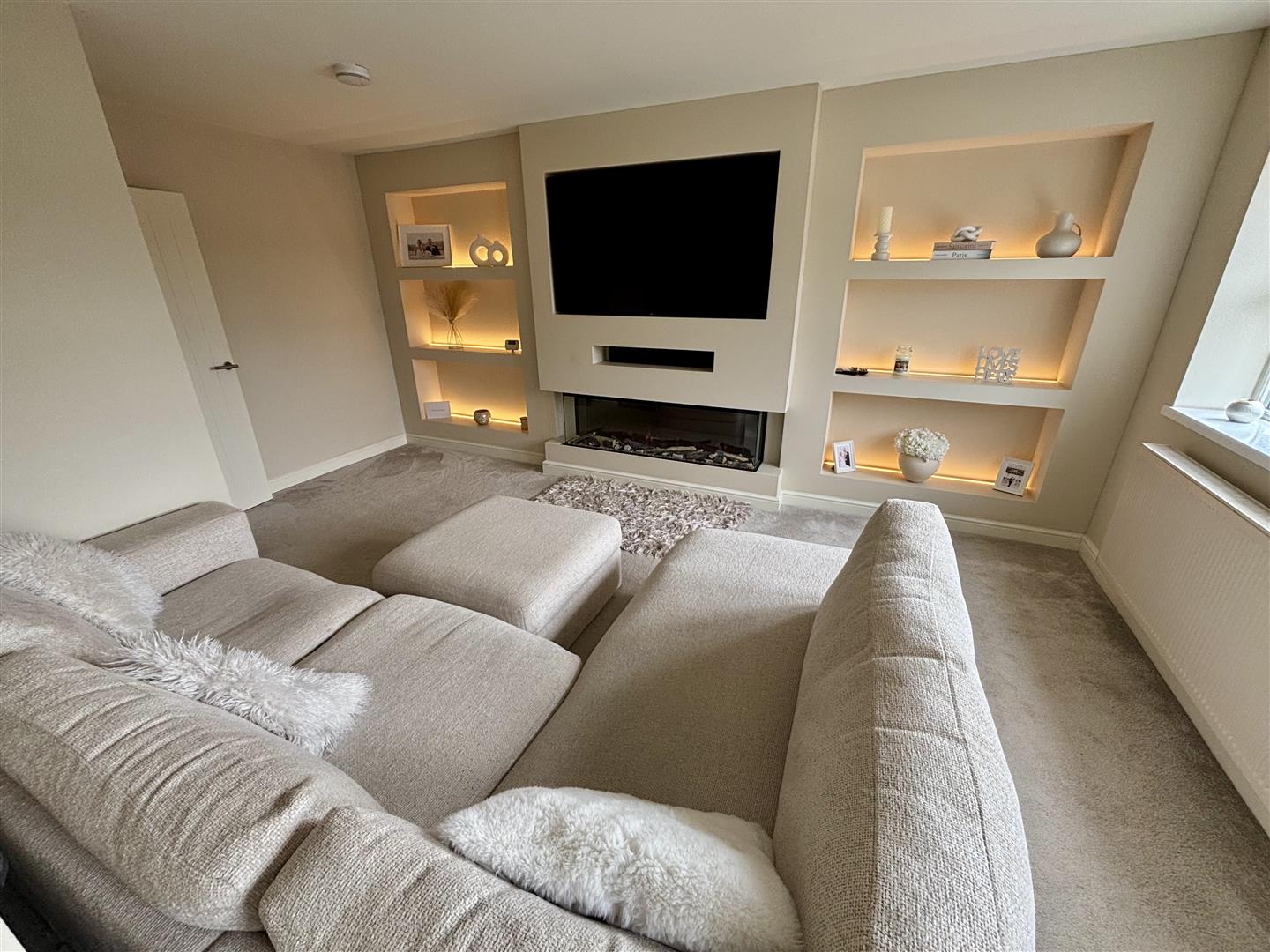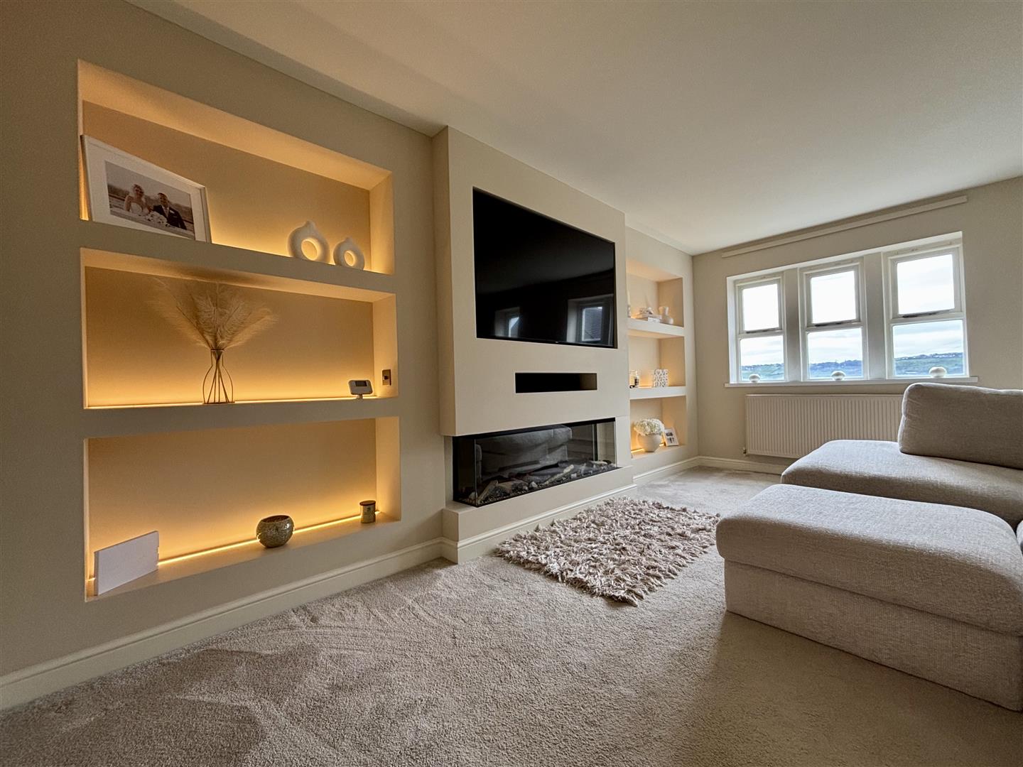 A well proportioned living room with an impressive modern media wall, back-lit with LED lighting and including a wall TV point, display shelving and a rectangular electric flame effect fire. Windows to the front elevation enjoying the open views and a central heating radiator.