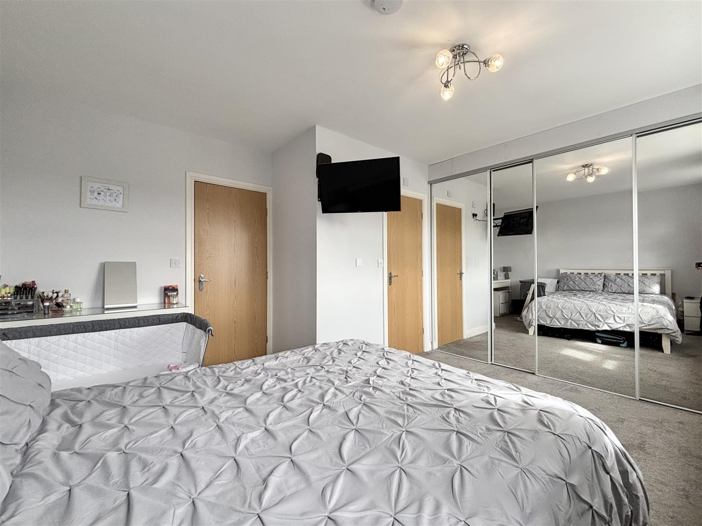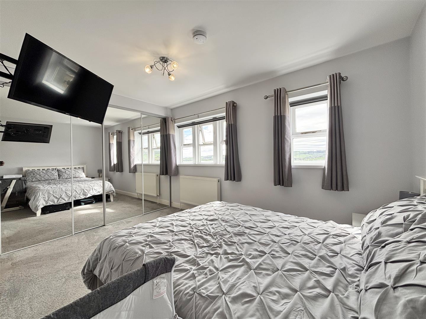 Two windows to the front elevation, wall-to-wall fitted wardrobes with mirror sliding doors, wall TV point and a central heating radiator. Door to: