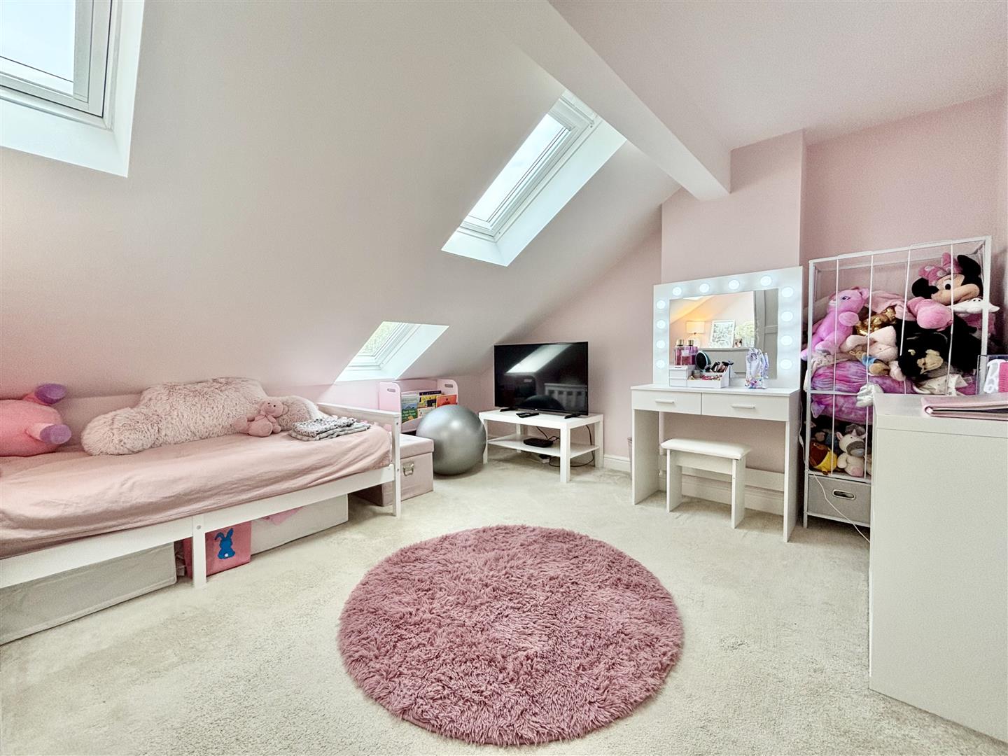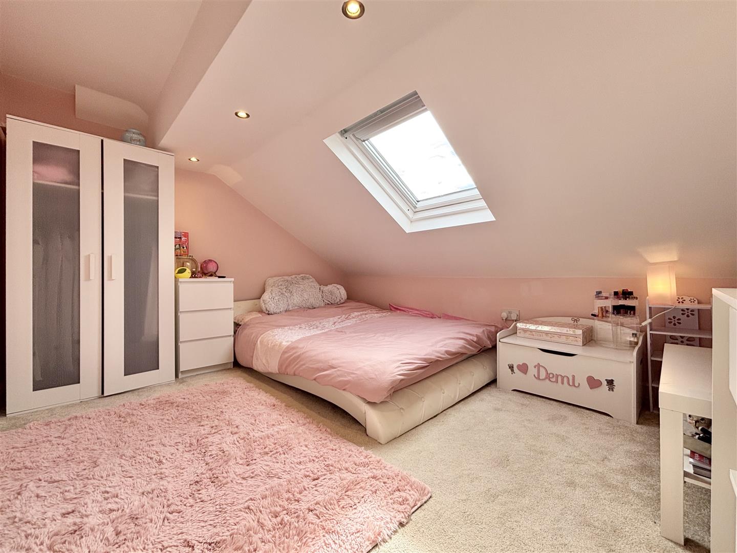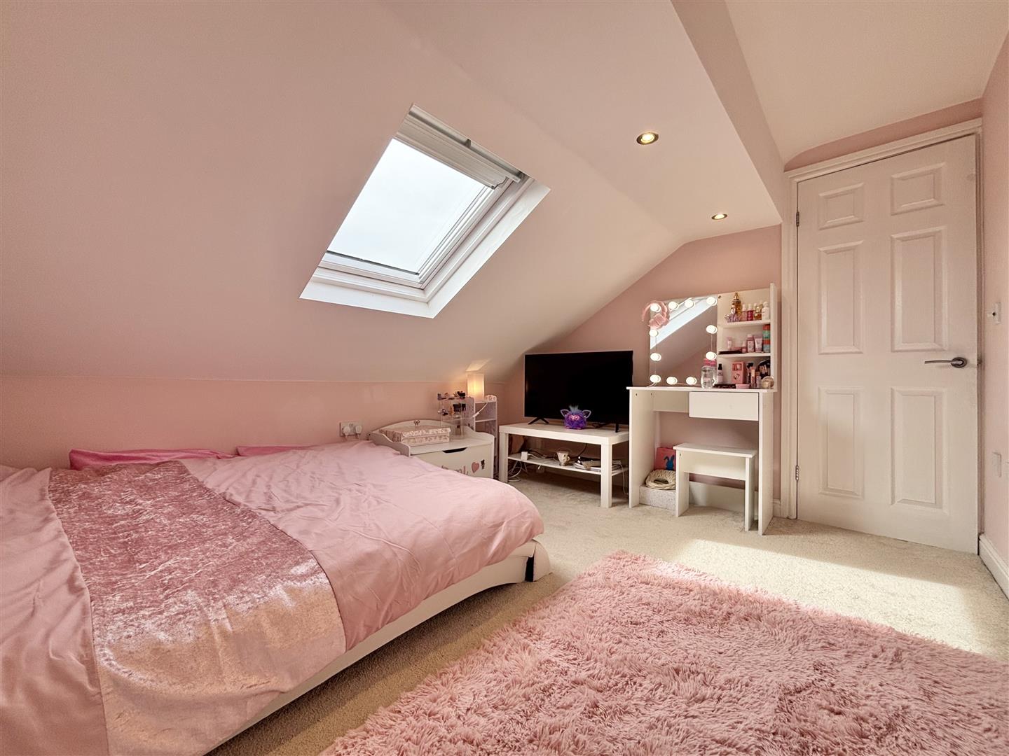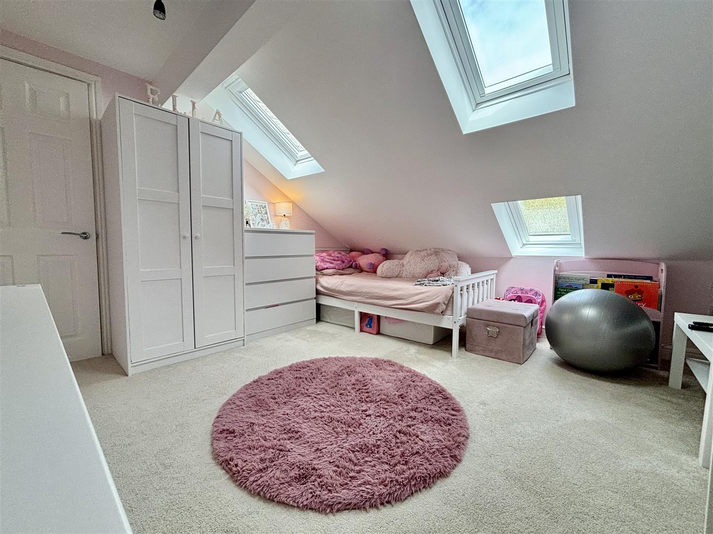 A light and spacious bedroom with three roof windows with integrated blinds and a central heating radiator.