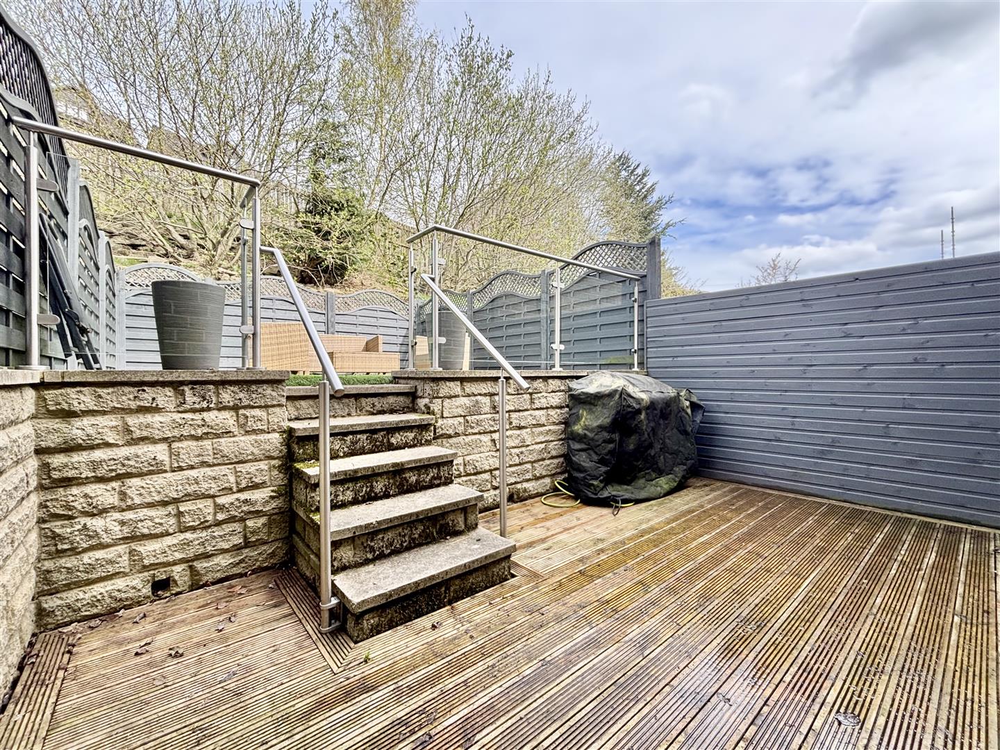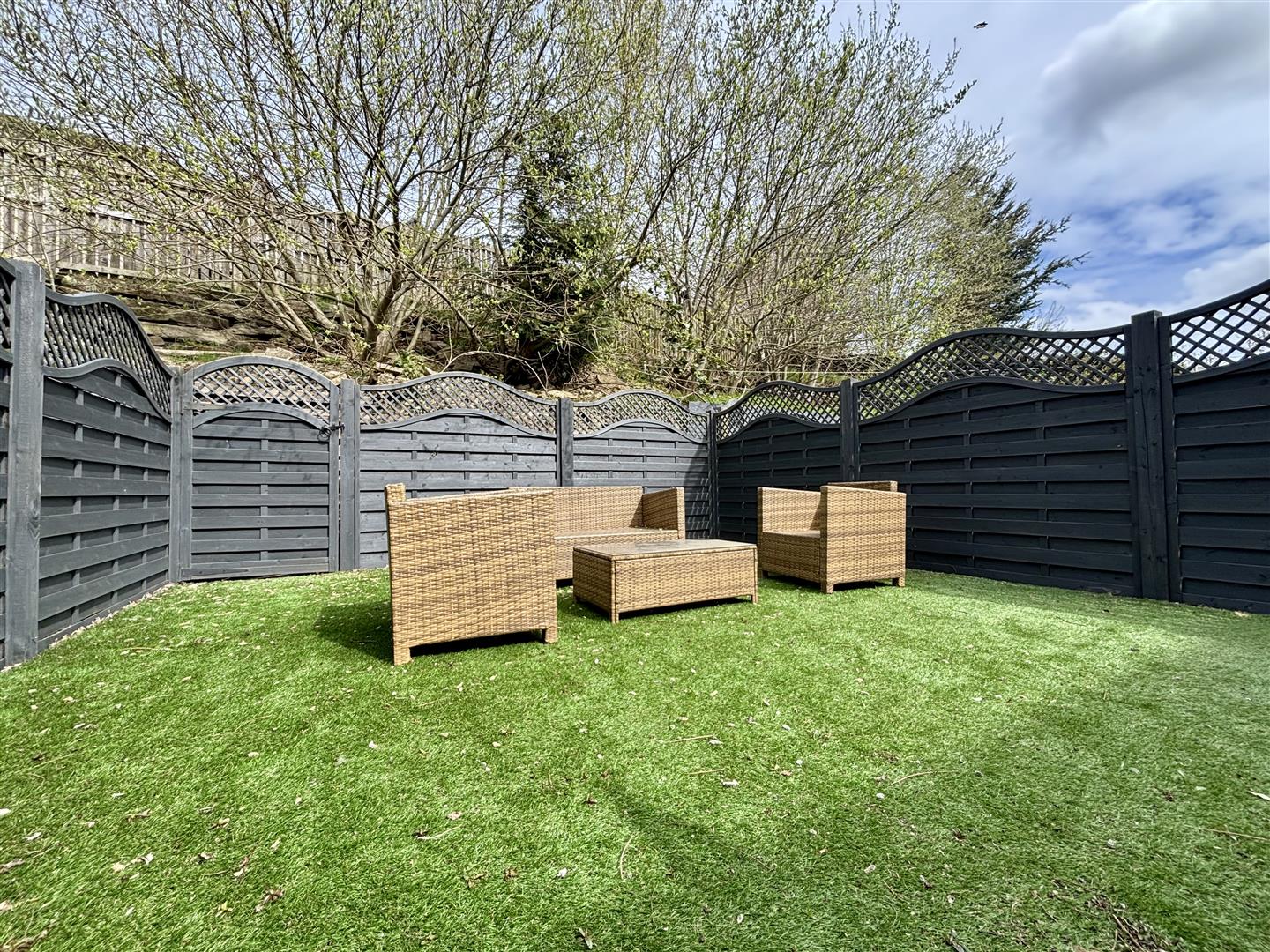 To the front of the property is off-road parking, electric car charge point, a small garden with artificial grass and a bin store area. To the rear is a private, fully enclosed garden space consisting of a decked patio with steps up to a further seating area with a glass balustrade, artificial grass and a fenced boundary.