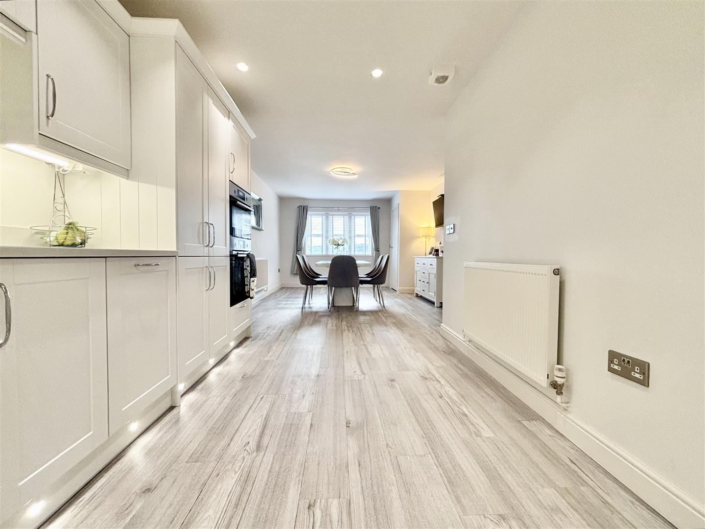 Stairs lead off to the first floor, central heating radiator, grey wood effect laminate flooring that flows through to the kitchen.