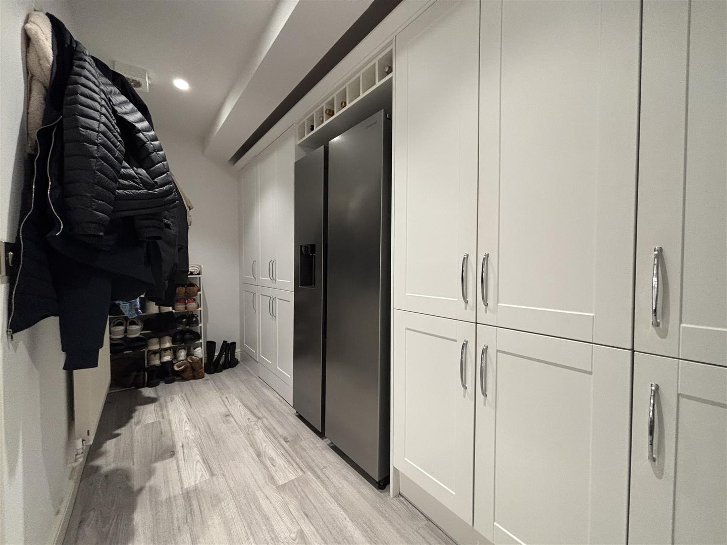 Fitted with matching floor to ceiling cabinets providing a large amount of additional storage and space for an American style fridge-freezer. Coat hooks, space for shoes and further storage.