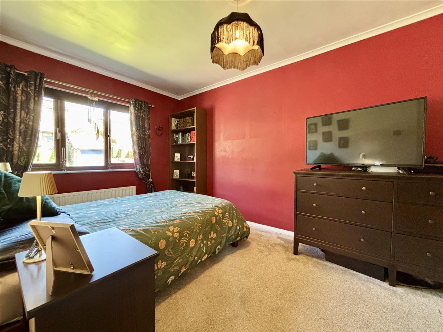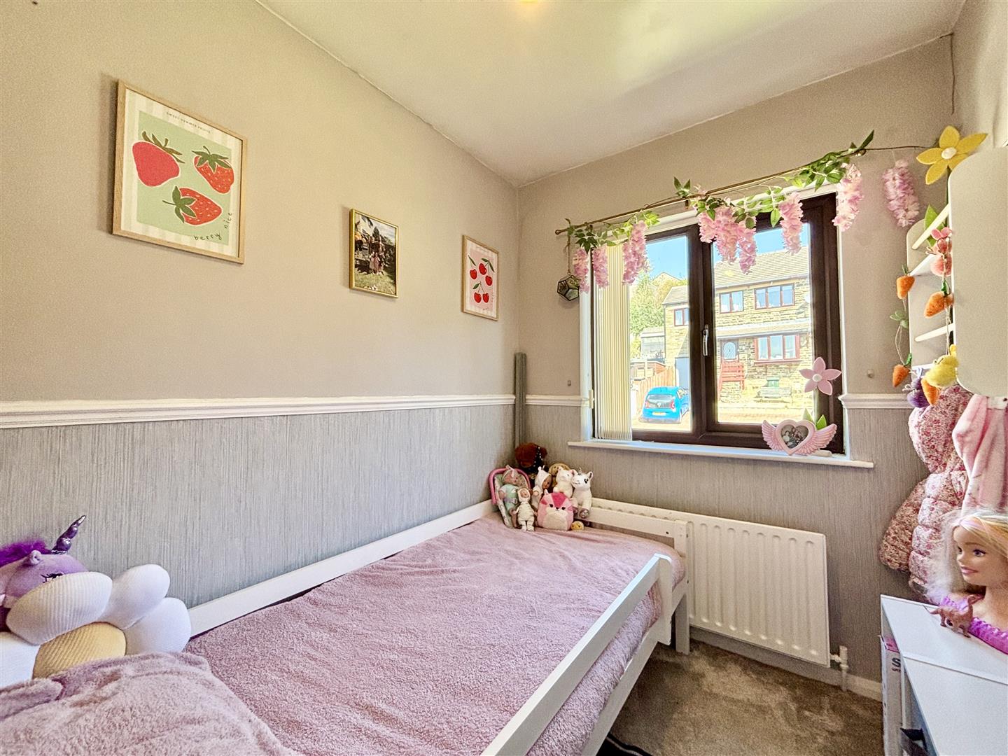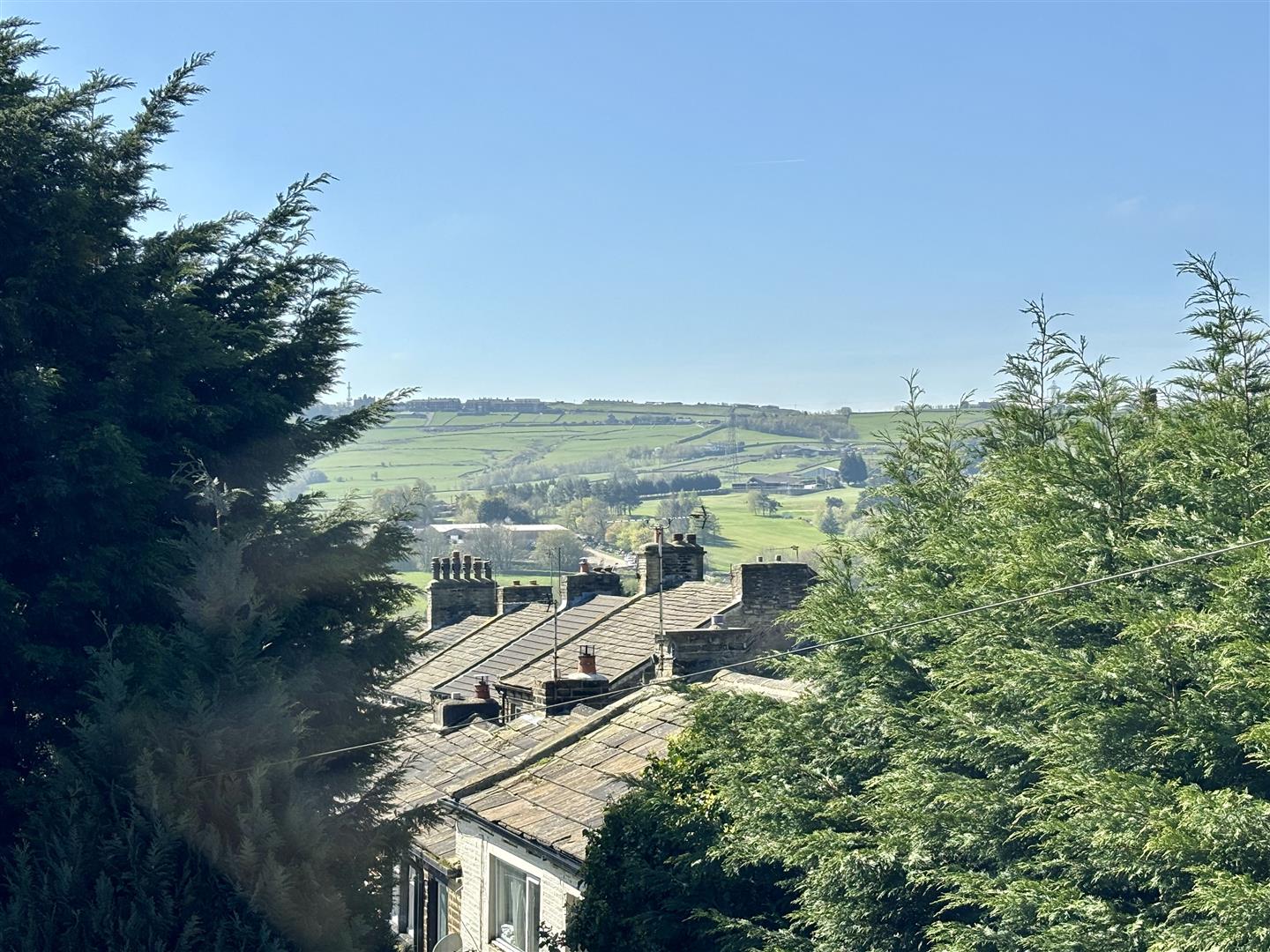 Window to the rear elevation with distant views across to Queensbury and a central heating radiator.