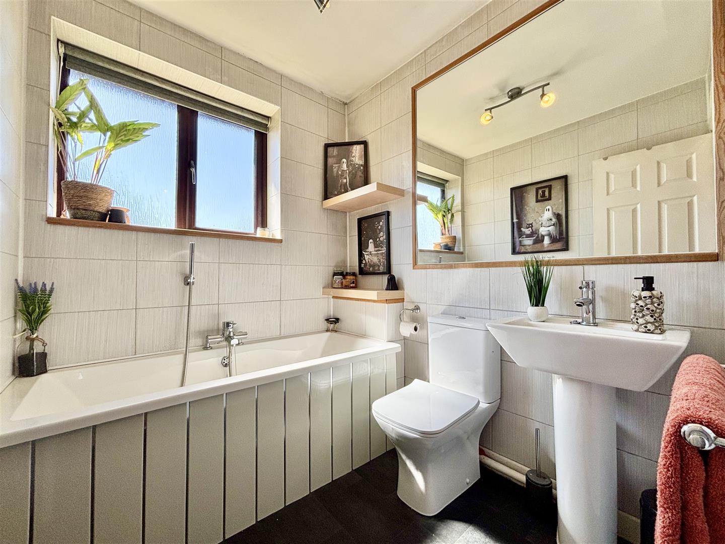 A white bathroom suite consisting of a panelled bath with centre taps and a shower attachment, pedestal washbasin and a low flush WC. Fully tiled walls, fitted mirrors, window to the rear elevation and a central heating radiator.
